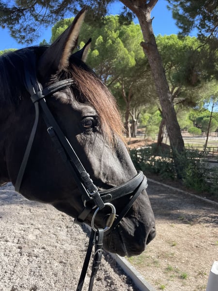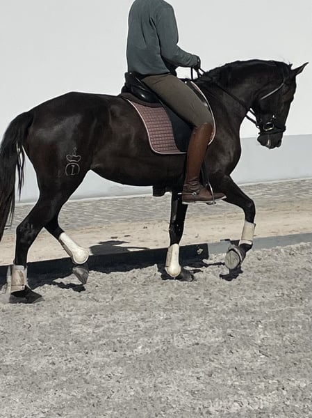 Sinfonia is a beautiful black mare who enjoyed her youth in a herd in freedom at our stud (www.coudelaria-linda-oliveira.com). Now, at three and a half years old, she is stabled and has been gently started under saddle. In summer, her coat shines chocolate brown, and in winter she is a black. She shows exemplary rideability and willingness to cooperate in her first steps under saddle. She possesses three good basic gaits, a harmonious conformation, and the proverbial "clear mind" of a Lusitano. She will bring much joy to her future owner and be a great partner. This is an opportunity to find and secure your dream horse at this early stage. She can stay with us for further training, and we also offer the rider the option to stay in our comfortable guesthouse and grow together with their horse through excellent lessons. She could also be of interest for breeding, as she has very good bloodlines from the Ortigao Costa breeding in her pedigree and can pass on the rare black color in Lusitanos. For more details and information, feel free to contact us via WhatsApp at +49 17644482124.