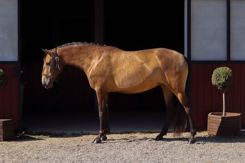 Esta joven yegua, aún en pleno crecimiento (seguirá creciendo unos centímetros más), no solo es preciosa. Además, cuenta con la certificación France Dressage. Recién estrenada en la doma, muestra muchas ganas de aprender y comprende muy rápidamente lo que se espera de ella. Además de su belleza y su capacidad de aprendizaje, posee un linaje excepcional: Dardo de la Plaine (Xerife XL) x Coral da Broa
