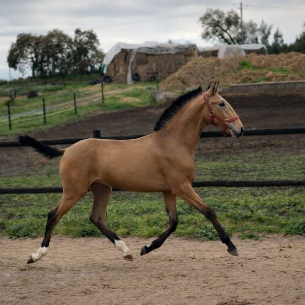 ✨VENTIL DE SENA✨ Buckskin with RUBI and HOSTIL lineage & promising sporting potential VENTIL DE SENA Features: - Breed: Lusitano - Sex: Stallion - Year of Birth: 2025 - Color: Buckskin - Height: approximately 16.1 hh (estimated final height) ⸻ An exceptionally typy Lusitano colt, impressing with his sought-after buckskin color, strong pedigree, and friendly character. A young horse with genuine potential – suitable for sport, breeding, and discerning Lusitano enthusiasts. ⸻ 🧬 High-quality pedigree: ✨ Sire: HOSTIL DE SENA • Approved with 70.5 points • Represents rideability, substance, and willingness to perform ✨ Dam: NERUDA DE SENA • Approved with 71.51 points • Descended from the renowned RUBI, one of the most influential Lusitano sires in international dressage ➡️ A genetic combination of athleticism, quality, and proven bloodlines. ⸻ 🐎 Movement & quality: • Very elegant, elastic basic gaits • Expressive movement pattern • Good natural balance ➡️ VENTIL already demonstrates power, elasticity, and presence – excellent prerequisites for a future sporting career. ⸻ 🧠 Character & development: • Knows the basics of foal training • Loving, friendly, and human-oriented • Clear-minded and attentive ➡️ A young stallion with an honest, pleasant nature and a very good attitude. ⸻ 🌿 Rearing: VENTIL is raised appropriately, allowing him to develop calmly – an ideal foundation for a healthy, capable sport horse. ⸻ 🎯 Future prospects: VENTIL DE SENA is ideal for: • Future dressage or working equitation disciplines • Breeding enthusiasts due to his high-quality bloodlines • Lovers of exceptional Lusitanos with color and quality ⸻ ⭐ Summary: VENTIL DE SENA combines: ✅ Buckskin special color ✅ RUBI bloodline ✅ Approved parents ✅ Excellent movement ✅ Loving, clear character ➡️ A young horse for those seeking something special and wishing to raise a Lusitano foal with real potential. ⸻ 📞 Contact & Viewing VENTIL DE SENA can be visited by appointment. I look forward to serious inquiries and am happy to take time for a personal conversation.