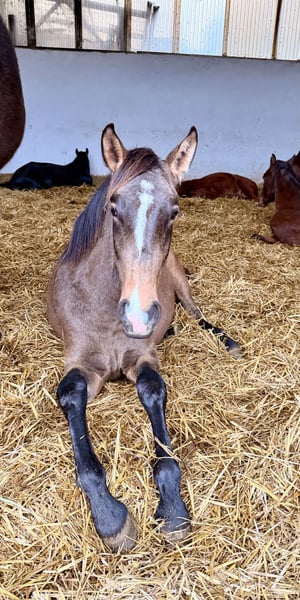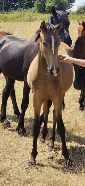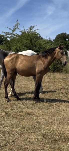 ⭐ Uncas – Exceptional Lusitano Foal in Rare Buckskin with Dorsal Stripe | Elite Lineage & Show Potential ⭐ Born on April 1, 2024 | Buckskin without Grey Gene | Approx. 16.1 hh expected Features: - Breed: Lusitano - Sex: Colt - Year of Birth: 2024 - Color: Buckskin - Height: 16.1 hh (estimated final height) With Uncas, I am offering a top-quality, typy, and genetically valuable Lusitano colt from outstanding lineage. His rare buckskin color with a prominent dorsal stripe and his expressive face with a distinctive marking make him a true eye-catcher. ⸻ 🔥 Exclusive Lineage – Half-brother of the renowned FUEGO FG Uncas is a genetically highly interesting young horse: • Sire: NAVALHEIRO (OPUS-72) – known for rideability, expression, and excellent movement quality • Half-brother to FUEGO FG, an internationally recognized Lusitano from exceptional breeding • No grey gene carrier, ideal for color-stable breeding lines This pairing is rare and especially valuable for breeding and sport. ⸻ ✨ Color, Type & Presence Uncas impresses with: • His rare buckskin color with a distinct dorsal stripe • A unique facial marking – absolute recognition factor • Baroque, compact conformation • Correct foundation and harmonious proportions • People-oriented, clear, and friendly character Estimated final height: approx. 16.1 hh – ideal for Working Equitation, classical dressage, and show. ⸻ 🕊️ Movement & Potential His movements are: • Spacious • Light-footed • Elastic • Powerful and rhythmically correct Thanks to his natural willingness to collect, agility, and excellent balance, he offers outstanding potential for: • Working Equitation • Baroque & Liberty Dressage • Show performances • Classical dressage He has that certain “something” that immediately stands out in the arena. ⸻ 🐎 Health & Upbringing Uncas is raised under the best conditions in Germany and receives everything a healthy young horse needs: • Proper foal management for a young stallion • High-quality forage & mineral feed • Familiar with halter and farrier • Fully vaccinated • Never been ill His handling is exemplary for his age – well-behaved, curious, and calm. ⸻ 💎 Why Uncas? Because he is a special young stallion with rarity value: ✔ Rare buckskin color with dorsal stripe ✔ Excellent lineage (half-brother of FUEGO FG) ✔ Expressive movements ✔ Baroque, compact type ✔ Clear mind & fine temperament ✔ Ideal for show, sport, and breeding ⸻ 📞 Contact & Viewing Uncas can be visited by appointment. I look forward to serious inquiries and am happy to take the time for a personal conversation.