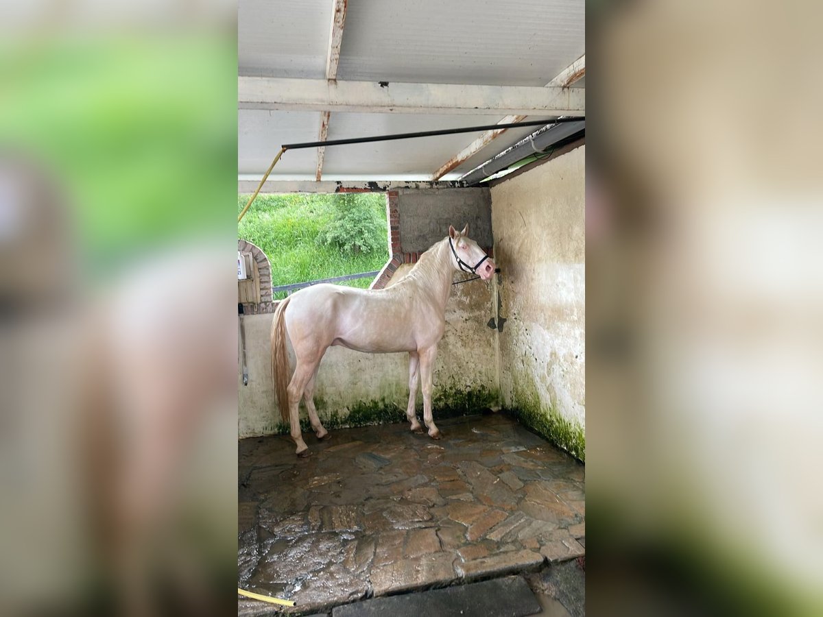 Caballo lusitano de 3 años, registrado en el libro de cría APSL. Abrigo perlino/cremello. Muy barroco. Trabajando en la cuerda. Ubicado en la zona libre de piroplasmosis.
