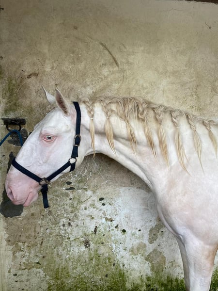 3-jähriger Lusitano-Hengst, im APSL-Stammbuch eingetragen. Perlino/Cremello-Fell. Sehr barock. Arbeit an der Longe. Befindet sich in der Piroplasmosen-freien Zone.