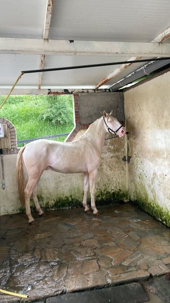 3 years old Lusitano Stallion, registered in APSL Stud book. Perlino/Cremello coat. Very baroque. Working on the lounge. Located in thhe Piroplasmosis Free zone.