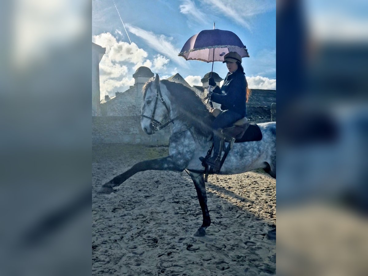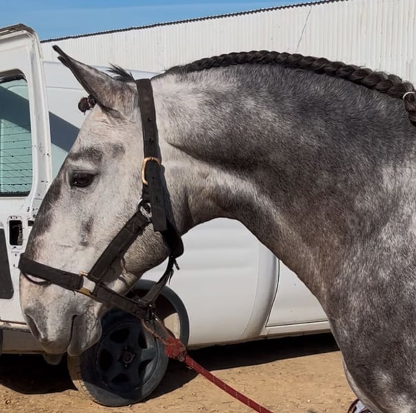 Cheval lusitanien pleins papiers entier , choisi et importé de l'élevage " Palha " à Lisbonne ( Portugal) . Né en 2019, 1m58 De la force, qualité de galop et équilibre ++ Cheval monté à une main. Léger et maniable. Sort en extérieur seul et accompagné, va dans l'eau, passe partout. Bien dressé, pas espagnol, passage, révérence. Expérience en spectacle et en tournage pour le cinéma. Cheval prêt pour la guerre.