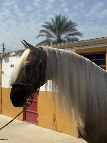 Oro, Lusitano stallion born 2017 and ap. 167 cm. The most beautiful horse! Oro is a stunning stallion with an amazing mentality, he's very kind and sweet to handle and ride. He's well trained and does all lateral exercises, flying changes, Spanish walk and piaffe. Oro often goes out hacking and is used to traffic and different environments, he has no problem to go hacking with a group of horses. Oro is a Lusitano but he has no pedigree in his passport (cruzado). Oro is located in southern Spain and we help with all the steps in the buying process. Read more about us at www.cthorsesales.com Contact: info@cthorsesales.com