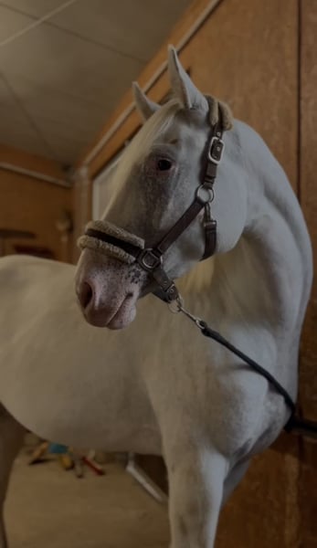 Homozygous white-born tiger-spotted mare. LP/LP, Patn1/Patn1, A/A, E/e, D/nd2. She is in foal to Lord Europe for 2026. From this pairing, only a brown tiger or a brown tabby tiger can be expected. Well-behaved and uncomplicated in handling, well lunged, not yet ridden. She is eligible for breeding in Germany (Stutbuch 1), and her offspring can also be registered with Kwpn Reg. A. The pedigree of the foal is visible on the documentation. Calm with the farrier and relaxed during transport.