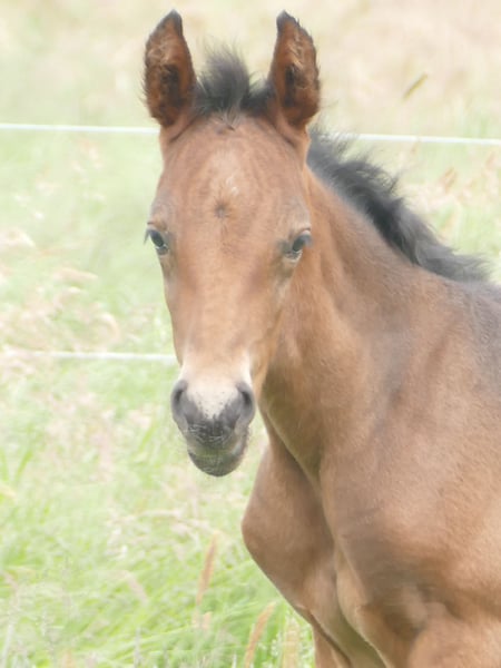 Esco vom Hartungshof geb.am: 31,05.2025 mittel- bis dunkelbraun mit nur ein paar weißen Stirnhaaren und einmal weiß gefesselt. Er ist charmant, neugierig und ein echter Bewegungskünstler mit großartiger natürlicher Aufrichtung, der aber durchaus real auch einen guten "Grundschulabschluss" hingelegt hat , sprich er beherrscht das Fohlen- ABC (Halftern, Füße geben und sich um Mama rundum führen lassen). Seine Gangveranlagung sind sowohl die Marcha Batida wie auch die Marcha Picada. Esco wurde regelmäßig entwurmt und erhielt bereits seine ersten Impfungen gegen Tetanus / Influenza und Herpes. Auch eine Hufkorrektur findet regelmäßig statt. Ich kann leider nicht so sehr viele Bilder ab Juli 25 einstellen, da ich selbst dazu seit Juli aus gesundheitlichen Gründen kaum mehr in der Lage bin zu fotografieren. Esco lebt jetzt in einer Gruppe von fast 20 Pferden von 6 Monate bis 29 Jahre alt - die jungen spielen mit einander, die alten leisten wertvolle Erziehungsarbeit.