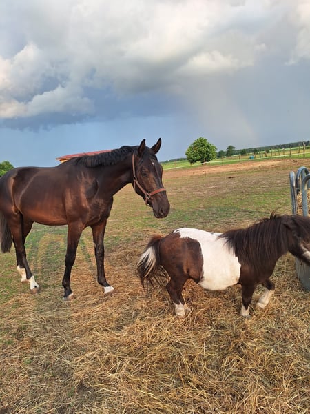 Zum Verkauf steht ein vielversprechender 3-jähriger Wallach von So Unique aus einer Sancisco-Mutter – ein vielversprechender Youngster aus kleiner Privatzucht, der seine Qualität bereits als Fohlen bewies und dafür die Elitefohlenprämie erhielt. Der Wallach ist im Herdenverband aufgewachsen und kennt dementsprechend andere Pferde, verschiedenste Fahrzeuge, andere Tiere und Kinder. Er wurde im Sommer schonend angeritten und durfte anschließend noch einige Monate auf der Sommerwiese, um sich in Ruhe weiterzuentwickeln. Nun ist er wieder eingestallt und bereit für den weiteren Ausbildungsweg. Sein ausgeglichenes, freundliches Wesen macht ihn zu einem sehr angenehmen Partner im täglichen Umgang. Stanford überzeugt mit sehr qualitätsvollen Grundgangarten und viel Balance. Bereits beim Anreiten zeigte er eine natürliche Versammlungsbereitschaft. Er kennt Freispringen und zeigte auch dabei viel Mut und Übersicht. Aufgrund eines optischen Schönheitsfehlers – einer Flüssigkeitsansammlung oberhalb des Sprunggelenks aufgrund eines tierärztlich behandelten Sakkroids wird er deutlich unter Wert abgegeben. Das Gelenk wurde geschallt und ist ohne Befund. Der tierärztliche Bericht dazu liegt vor. Es stellt keine Beeinträchtigung für sportlichen Einsatz dar, reine Optische Veränderung. Wir verkaufen ihn schweren Herzens aufgrund mangelnder Zeit durch Familienzuwachs und weiterer eigener Nachzucht. Ein ideales Pferd für Reiter, die einen talentierten Youngster mit viel Herz, Qualität und bestem Charakter suchen. *Zähne sind frisch gemacht * Barhuf Am besten einfach vorbei kommen und anschauen. Gerne telefonisch melden 0162/2399140