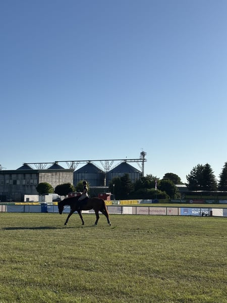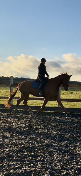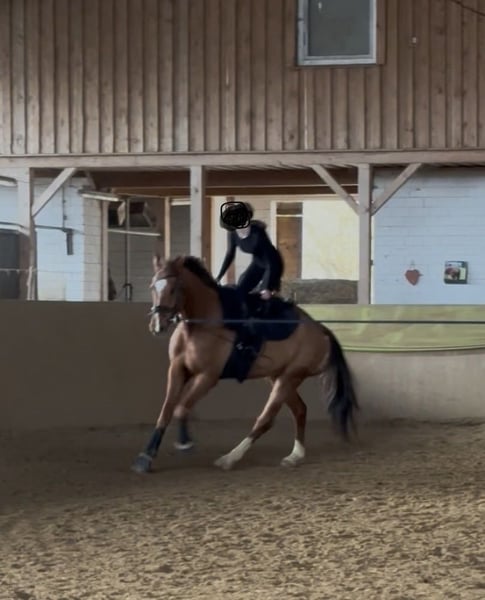 Aus Zeitmangel aufgrund meines Studiums steht mein 7 jähriger Wallach „Benno“ zum Verkauf. Er ist ca. 1,75m und deckt somit auch größere Reiter/innen sehr gut ab. Er befindet sich auf einem soliden A-Niveau in der Dressurarbeit. Im Parcours zeigt er sich auch stets motiviert und das regelmäßige Freispringen bereitet ihm viel Freude. Er zeigt dort Übersicht und ist stets ehrlich am Sprung. Auch, wenn der Fokus in unserer täglichen Arbeit nicht auf dem Springen liegt, wird Benno trotzdem regelmäßig mit Stangen gearbeitet. Er geht brav in der Gruppe ins Gelände und ist natürlich absolut Schmiede- und verladefromm. Ein wenig Turnierluft konnte er bereits schnuppern und verhielt sich dort jungpferdgerecht. Auch an einigen Lehrgängen auswärts hat er bereits teilgenommen. Benno ist ein richtiger Kumpeltyp und liebt es lange verwöhnt und umsorgt zu werden. Dem Menschen gegenüber ist er nie böse. Ich würde ihn als artiges Pferd bezeichnen, der mit seinem jungen Alter ab und zu nochmal etwas grün hinter den Ohren ist, aber stets händelbar bleibt und viel Quatsch mitmacht. Volti würde bisher einmal angetestet (siehe Fotos) dort zeigte er sich sehr brav und aufgeschlossen. Die Zähne wurden im Februar 2026 nochmal gemacht. Eine AKU aus 10/2023 liegt vor, eine aktuelle kann auf Wunsch und gegen Kostenübernahme gemacht werden. Wir freuen uns auf eure Nachrichten und beantworten gerne offene Fragen