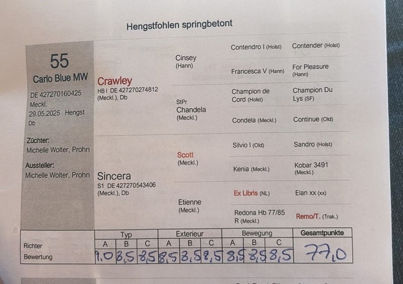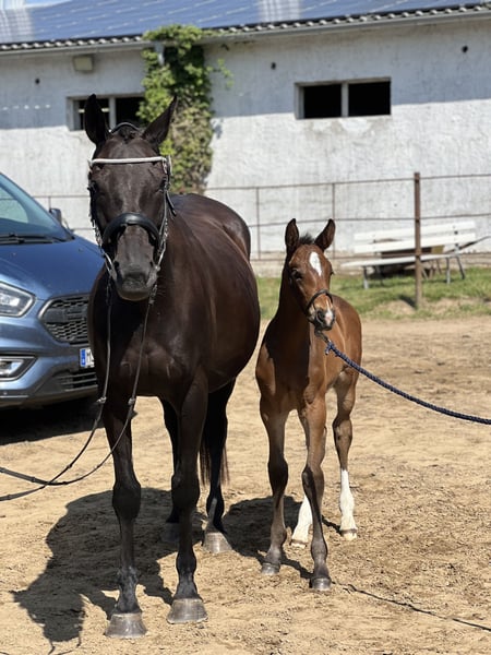 Wunderschönes Hengstfohlen – Elitefohlen Schweren Herzens biete ich mein selbstgezogenes Hengstfohlen zum Verkauf an. Er ist mein erstes eigenes Fohlen, daher fällt mir diese Entscheidung wirklich nicht leicht. Der Kleine wurde am 29.05.2025 geboren und konnte bereits eine Auszeichnung als Elitefohlen erhalten. Er überzeugt nicht nur durch seine Qualität, sondern auch durch seinen tollen Charakter: • sehr lieb und menschenbezogen im Umgang • kennt bereits Spaziergänge • lässt sich brav putzen • wächst aktuell artgerecht mit anderen Fohlen auf der Koppel auf Das Hufegeben hinten fällt ihm momentan noch etwas schwer, aber wir üben regelmäßig daran und er macht dabei stetige Fortschritte. Er ist ein absolut ehrliches, freundliches Fohlen mit viel Potenzial – sowohl für Sport als auch als treuer Freizeitpartner. Nur in gute, fördernde Hände abzugeben! Bei Interesse oder Fragen gerne melden.