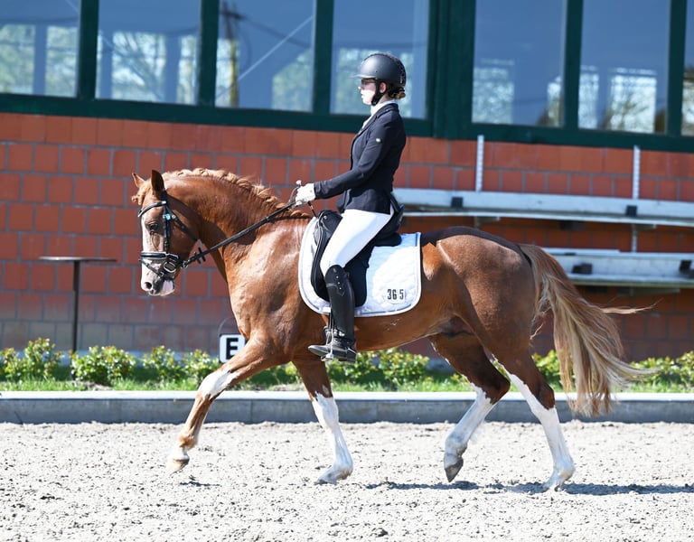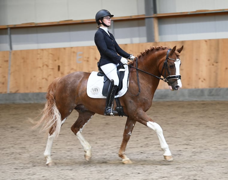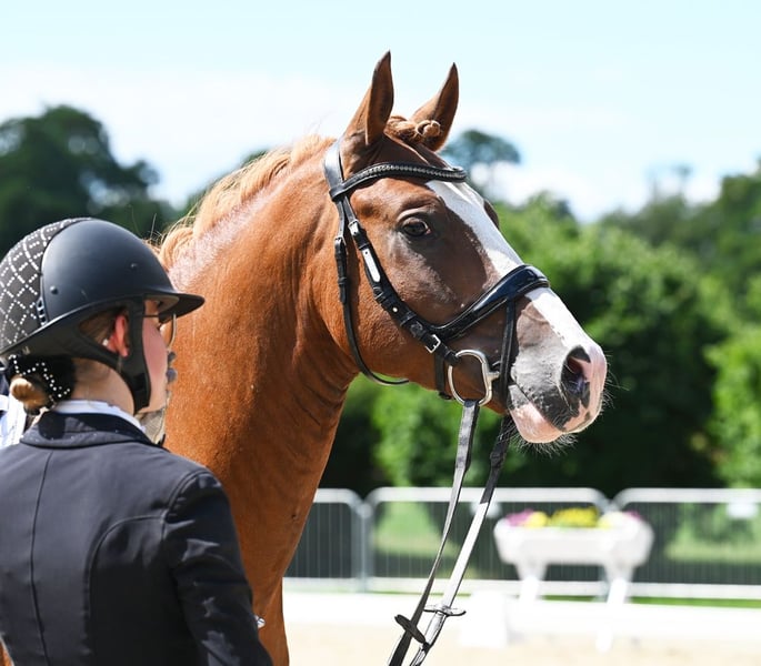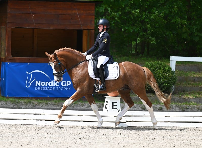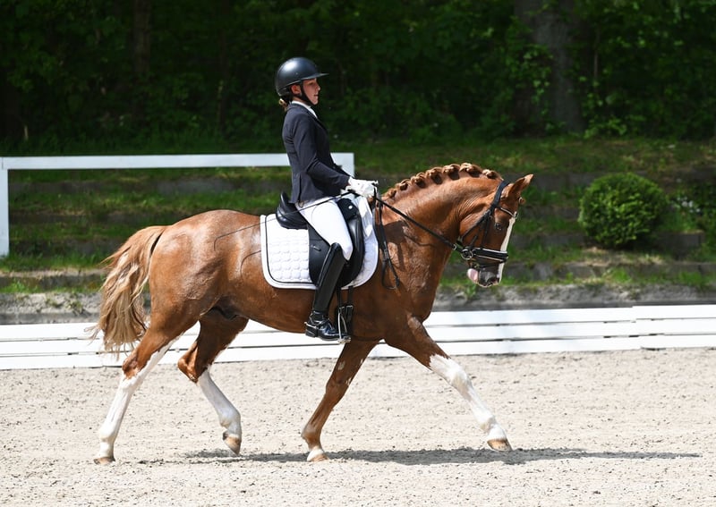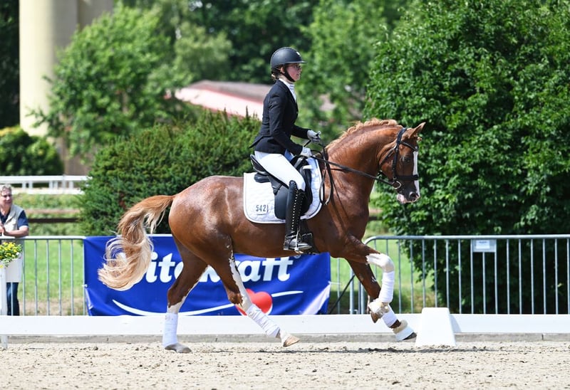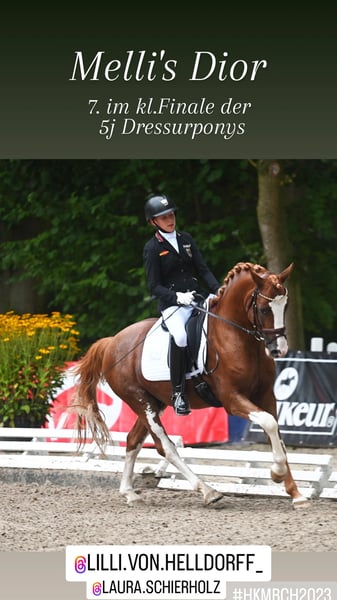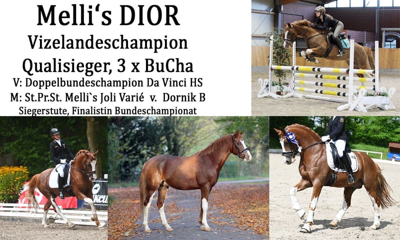 Kasztanowaty ogier urodzony w 2020 roku w Verden, Verband Hannover, księga ogierów I Zarejestrowany przez ZfdP – Związek Hodowców Niemieckich Koni Wzrost: 146 cm, wolny od choroby CA Składka na krycie: 300 € za jedną porcję (ok. 5-6 strzyków). Przy kolejnych kryciach z tej samej porcji, naliczana jest dodatkowa opłata 300 € za każdą kolejną ciążę; w przeciwnym razie nie wystawia się świadectwa krycia. Przy zamówieniu kolejnej dawki nasienia w tym samym roku dla tej samej klaczy, otrzymują Państwo rabat 100 €. Wysyłka przez Freeze & Breed. Prosimy o wcześniejsze zamówienie i przechowywanie u weterynarza, w stacji lub klinice. 2021 – 3. miejsce na Mistrzostwach Kraju, udział w Mistrzostwach Niemiec – zwycięzca konkursu na konia sportowego 2022 – plasuje się w konkursach na konia do ujeżdżenia A, na poziomie Eignungsprüfung oraz w konkursach na konia sportowego A i L – VIZELANDESCHAMPION i zakwalifikowany do Mistrzostw Niemiec – próba dzielności ogierów z wynikiem 7,96 2023 – zakwalifikowany do Mistrzostw Niemiec z Lilly von Helldorf, zwycięzca kwalifikacji – zwycięzca konkursu na konia do ujeżdżenia A, plasuje się w konkursach L 2024 – plasuje się w konkursie na konia do ujeżdżenia L z Laurą Schierholz 2024 – sprzedany młodej jeźdźczyni w wieku 8 lat – zakwalifikowany do Mistrzostw Niemiec z wynikiem 8,14 w Rastede pod opieką Elly Thielkes 2025 – osiągnięcia z młodą jeźdźczynią i w zaprzegu Dior to dwukrotnie utalentowany ogier marzenie, nie tylko ze względu na swoją urodę, ale także w zachowaniu i charakterze. Jest po prostu niesamowicie spokojny! Już jako źrebię chętnie brał udział w zabawach i uwielbia podesty, plandeki oraz pracę na ziemi, co można zobaczyć na zdjęciach poniżej. Jego ciekawość i odwaga, połączone z elastycznymi i przestrzennymi ruchami, wskazują na wszechstronną karierę. Chętnie umożliwimy Państwu odwiedzenie jego rodziny po wcześniejszym umówieniu. Od rodzeństwa po matkę, babcię, ciocie i niezliczone kuzynki ;-)