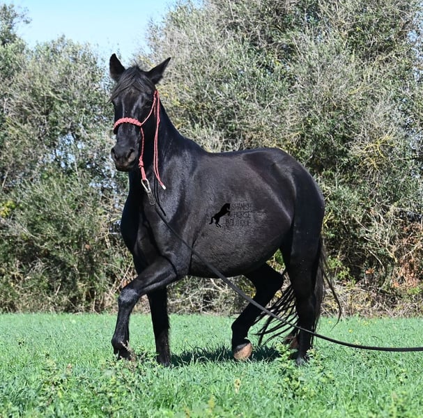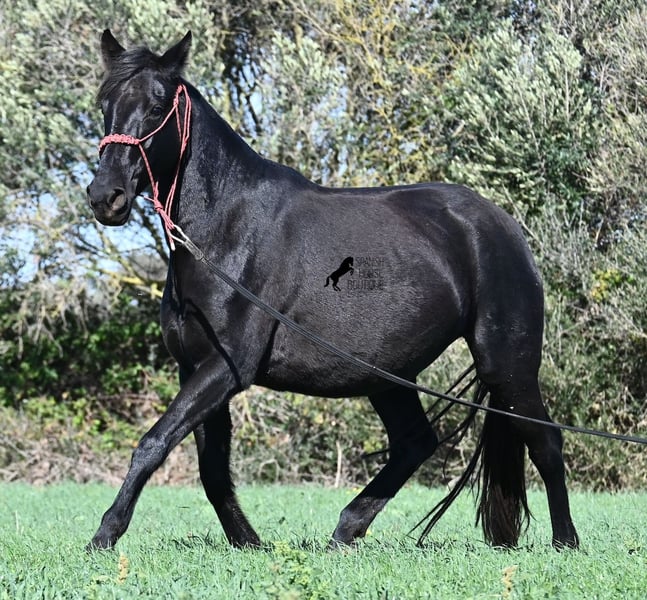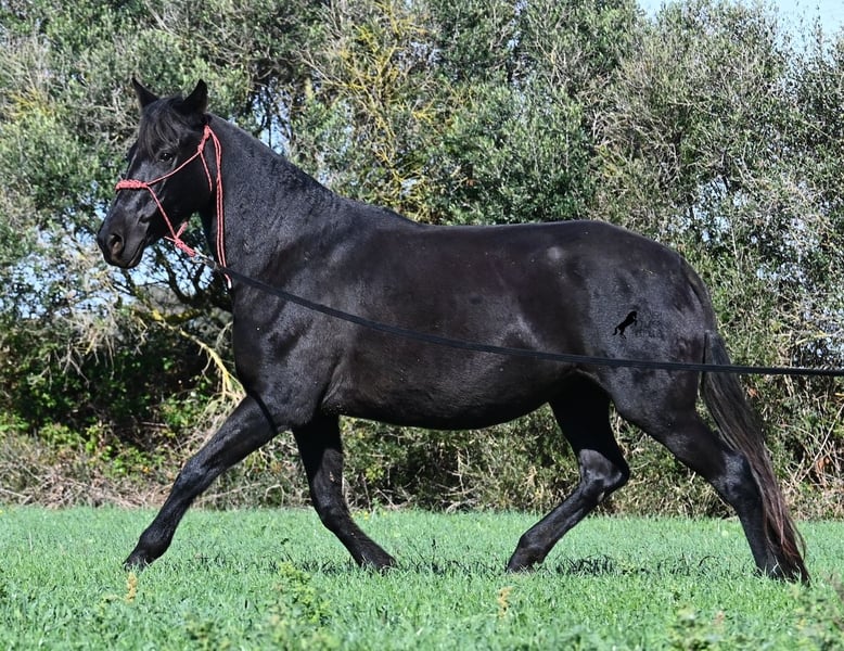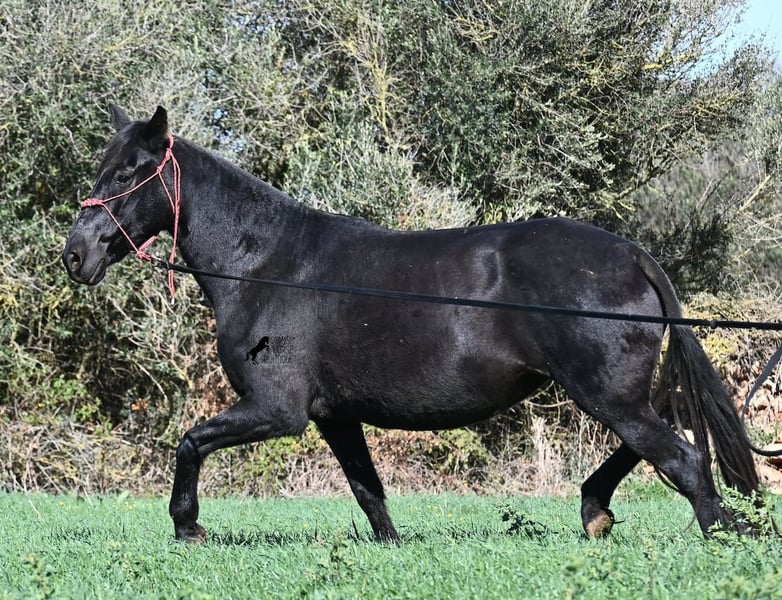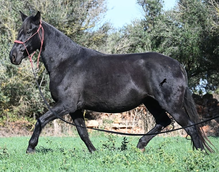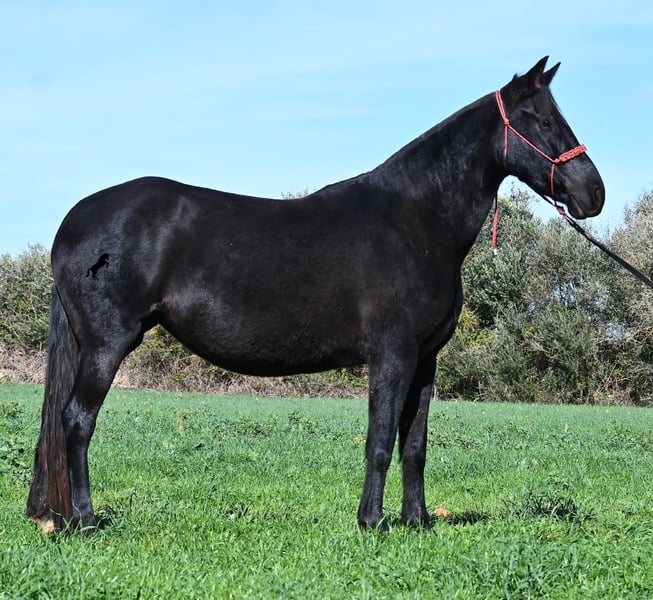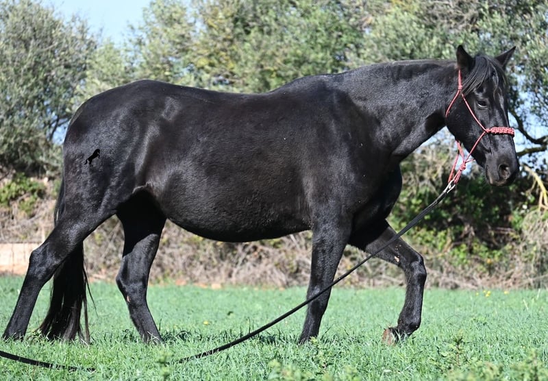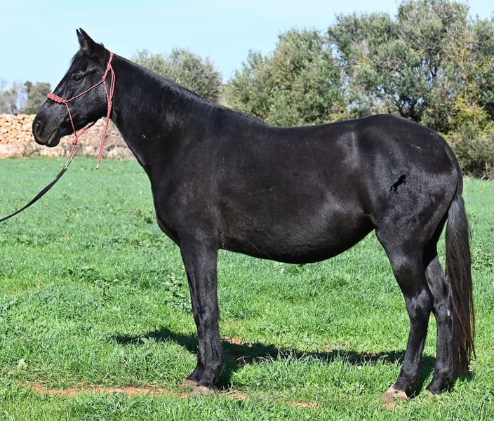 This 2016-born purebred Menorquín mare has been covered by an excellent stallion. Traditionally, breeding mares on Menorca are not ridden, so she is only halter-trained and loadable, still quite raw. She has already produced very good offspring and, although she stands at 154 cm (15.1 hh), she tends to pass on more height. She was bred by a stallion over 170 cm (16.3 hh), so a tall foal can be expected. The breeding was in February, and of course, the breeding certificate will be provided so that a full Menorquín registration for the foal can be applied for. She spends her daily life in all-weather turnout 24/7, which makes her very resilient, and her foals are also typically born on the field, as is customary on Menorca. Her dam was a regional sub-champion, making her pedigree interesting for both breeders and hobby breeders, and this at a fair price. She has a white marking on one hind leg; otherwise, she is completely black. Videos and pedigree details are available upon request. Her location is Menorca. I am happy to arrange a pre-purchase veterinary exam, transport, or her journey if you wish to view her in person. Further details can be found on my page or in a personal conversation. Greetings from Spain