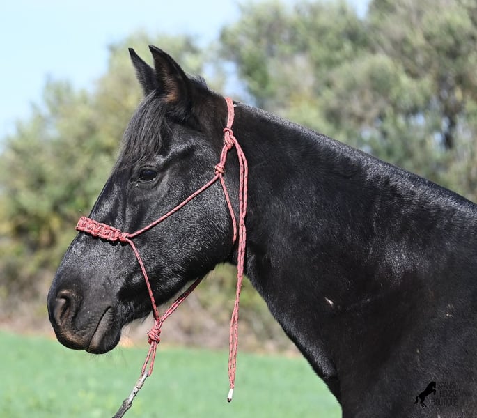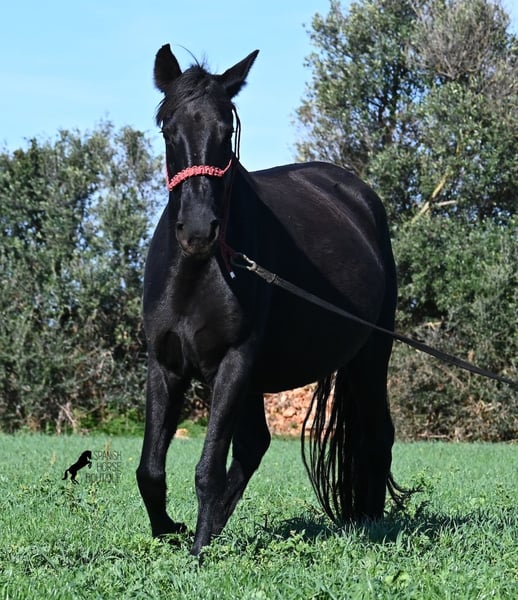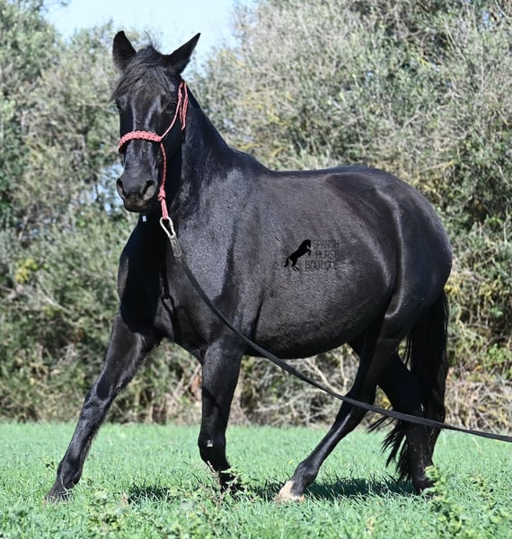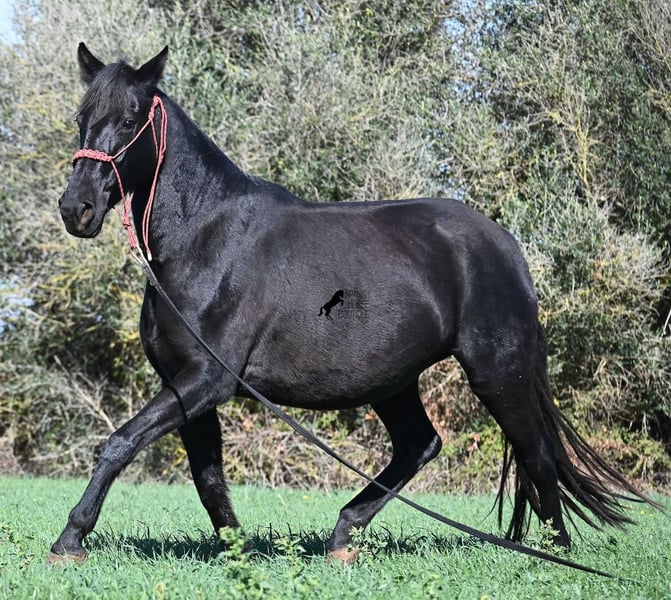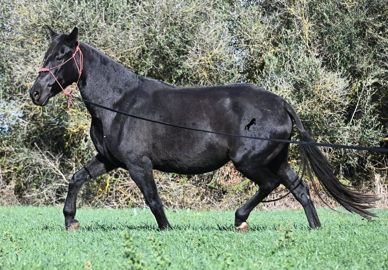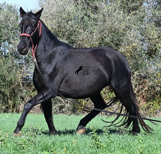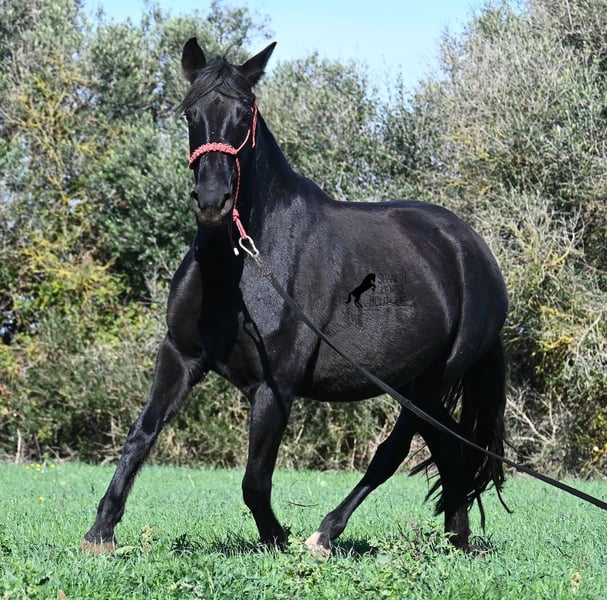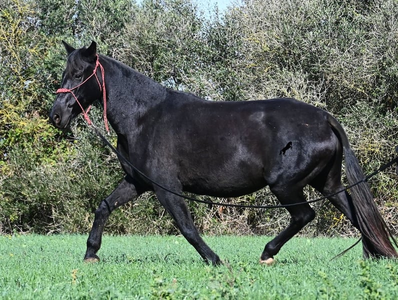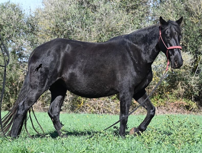 This 2016-born purebred Menorquín mare has been covered by an excellent stallion. Traditionally, breeding mares on Menorca are not ridden, so she is only halter-trained and loadable, still quite raw. She has already produced very good offspring and, although she stands at 154 cm (15.1 hh), she tends to pass on more height. She was bred by a stallion over 170 cm (16.3 hh), so a tall foal can be expected. The breeding was in February, and of course, the breeding certificate will be provided so that a full Menorquín registration for the foal can be applied for. She spends her daily life in all-weather turnout 24/7, which makes her very resilient, and her foals are also typically born on the field, as is customary on Menorca. Her dam was a regional sub-champion, making her pedigree interesting for both breeders and hobby breeders, and this at a fair price. She has a white marking on one hind leg; otherwise, she is completely black. Videos and pedigree details are available upon request. Her location is Menorca. I am happy to arrange a pre-purchase veterinary exam, transport, or her journey if you wish to view her in person. Further details can be found on my page or in a personal conversation. Greetings from Spain