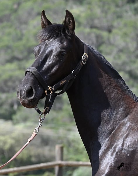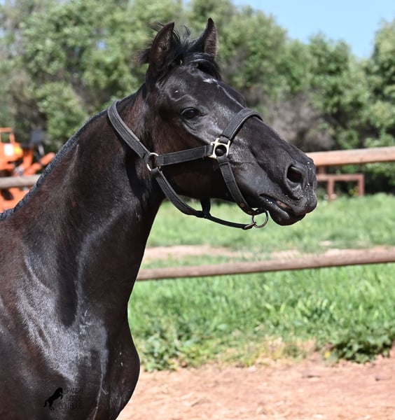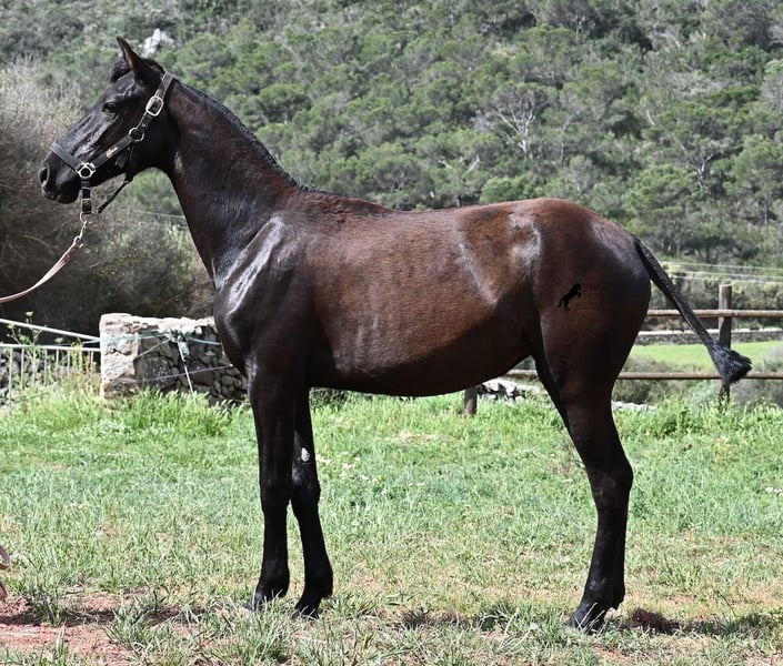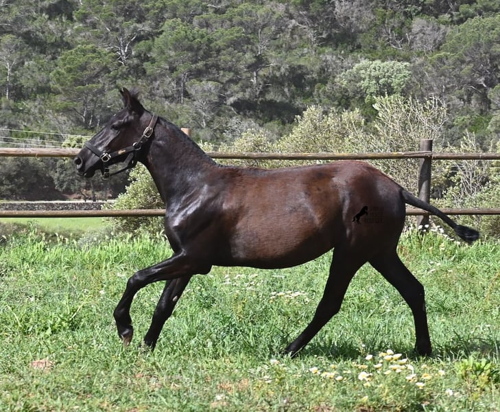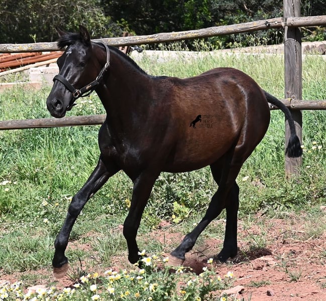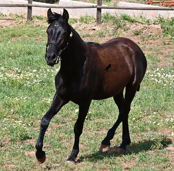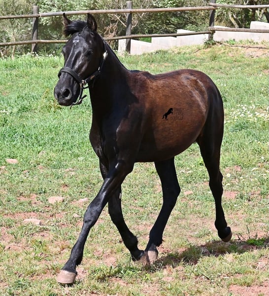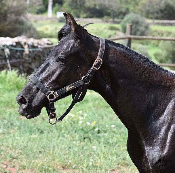 Diese 2025 geborene, reinrassige Menorquinstute, beweist, dass es in der Zucht vorkommt, dass vergangene Generationen stark durchschlagen können. Der Menorquin entstand, wie alle Rassen, aus einer Kombination mehrerer Rassen, bis ein festes Zuchtziel festgesetzt wurde. So ist der Araber viele Generationen im Hintergrund, doch wie man an dem Kopf und Exterieur dieser Stute sehen kann, kann er dennoch durchschlagen. Das macht sie für das heutige Bild des Menorquin eine echte Seltenheit. Allerdings bedeutet das auch, dass sie nicht unbedingt dem Zuchtziel entspricht und da wir auf Menorca traditionell Stuten nicht reiten und nur zur Zucht einsetzen, wird sie günstig für das heutige Preisfeld des Menorquin abgegeben, um einen Platz für sie als späteres Reit- oder Fahrpferd zu finden. In keinster Weise mindert das ihren Wert, es ist nur eine attraktive Gelegenheit für alle, die die Charakterzüge des Menorquin haben wollen, mit Mut, Klasse, Esprit und Ausdauer- zu einem "Schnäppchenpreis". Ihre Abstammung an sich ist beachtlich, denn sie ist die Tochter von einem der nur 3 Elitehengste der Rasse und auch mütterlicherseits finden wir gewichtige Tiere in der Abstammung. Also gute Qualität in exotischem Look :) Sie wird nicht allzu groß werden, um die 156cm und kompakt bleiben. Sie lebt in der Herde in 24h Robusthaltung, ist daher bestens sozialisiert und abgehärtet, dank des rauen Klimas auf Menorca. Man sieht auch an kleinen Macken, dass sich die älteren Stuten in der Herde gut um die Erziehung kümmern. Bis auf den Stern auf der Stirn ist sie komplett schwarz (tiefschwarz kommt bei Menorquin oft erst später) und orientiert sich noch sehr an anderen Stuten. Im Freilauf hat sie auch immer kurz gestoppt und kontaktfreudig nach anderen gewiehert. Im Umgang ist sie artig, braucht aber noch etwas Führung und es wäre schön, wenn sie jemanden findet, wo sie ein Familienmitglied wird und die Freundschaft zum Menschen weiter ausbaut, um auch alleine, ohne Pferdefreundinnen um sich, etwas ruhiger zu werden. Aktuell steht sie auf Menorca! Videos und Abstammung gerne auf Anfrage. Gerne organisiere ich vor Ort eine AKU, Transport oder auch ihre Reise, sollten Sie persönlich zum Anschauen kommen. Details dazu gerne auf meiner Seite oder im Gespräch. Saludos aus Spanien