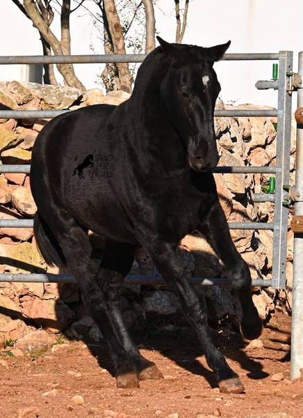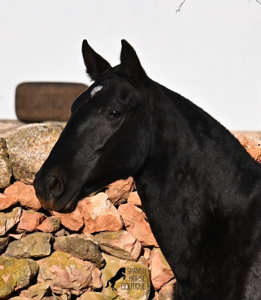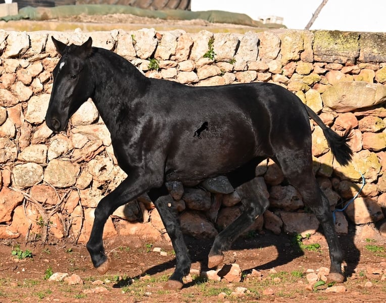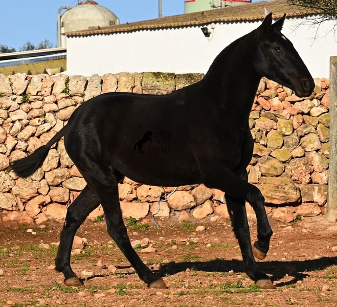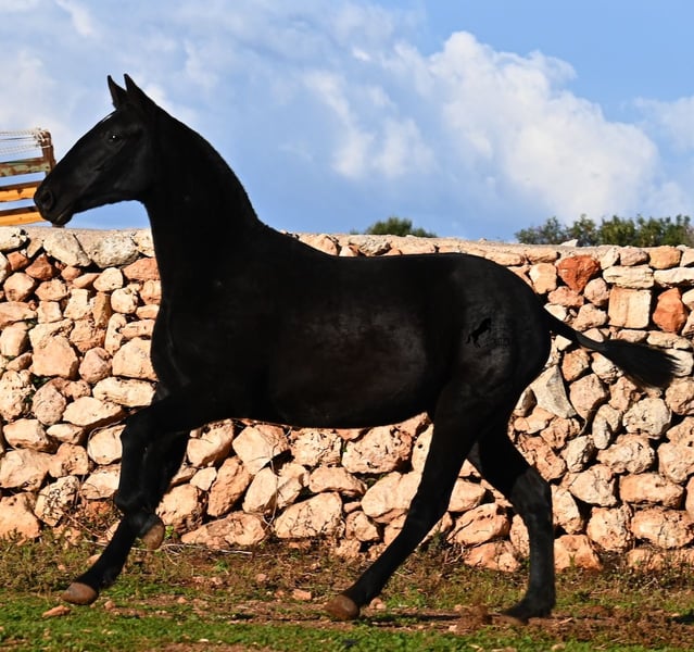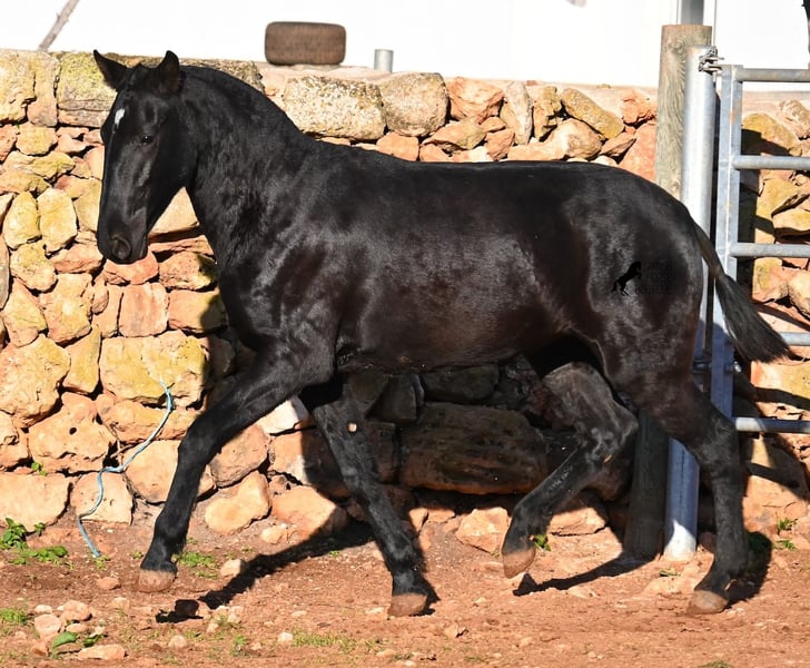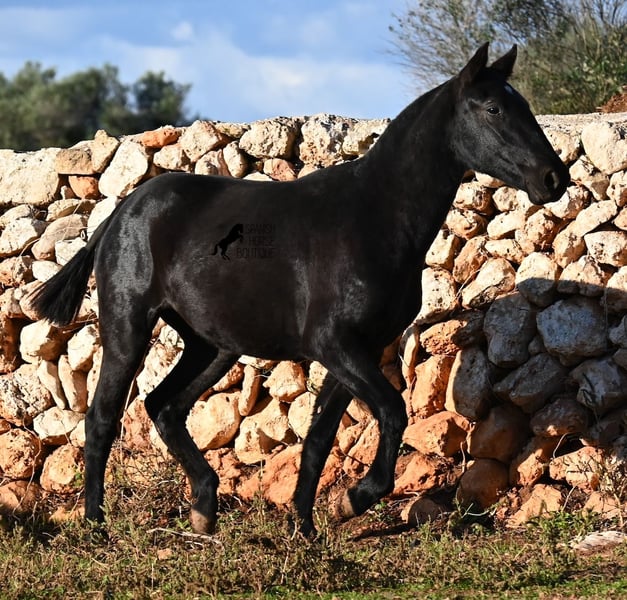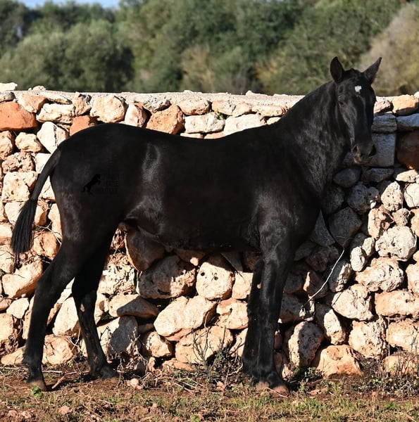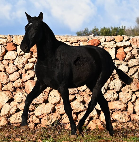 This purebred Menorquin mare, born in spring 2024, is a truly exclusive lady! She comes from a high-quality breeding program, and her dam has been awarded multiple prizes at breeding shows. Her sire is a breed champion and thus a world champion 😎. Her foal training includes thorough handling such as grooming, leading, hoof care, and loading. She is even familiar with lunging in a halter, as she was presented at a breeding show. This means she is comfortable being in new environments and around unfamiliar horses. She is able to enjoy her foal life on large pastures, grazing freely, and is kept together with mares of various ages, ensuring she is well socialized and well-mannered. Thanks to the rugged climate of Menorca, with occasional frosts, she will have no trouble adapting to different climates. Her expected final height is around 16.1 hh, and her compact conformation makes her suitable for many disciplines in riding later on. Apart from a small star, she is completely black, and her head is subtly subconvex, as is typical for her breed. Videos and pedigree are available upon request. Her current location is Menorca. I am happy to organize a foal health check (AKU), transportation, or her journey if you wish to visit her in person. Details can be found on my website or discussed directly. Greetings from Spain