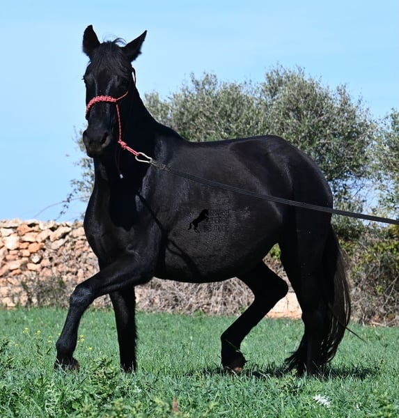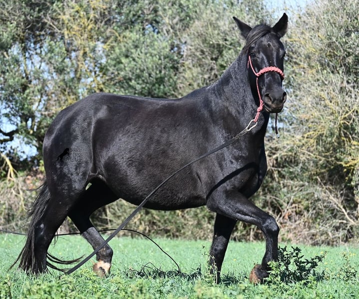 This 2016-born purebred Menorquín mare has been covered by an excellent stallion. Traditionally, breeding mares on Menorca are not ridden, so she is only halter-trained and loadable, still quite raw. She has already produced very good offspring and, although she stands at 154 cm (15.1 hh), she tends to pass on more height. She was bred by a stallion over 170 cm (16.3 hh), so a tall foal can be expected. The breeding was in February, and of course, the breeding certificate will be provided so that a full Menorquín registration for the foal can be applied for. She spends her daily life in all-weather turnout 24/7, which makes her very resilient, and her foals are also typically born on the field, as is customary on Menorca. Her dam was a regional sub-champion, making her pedigree interesting for both breeders and hobby breeders, and this at a fair price. She has a white marking on one hind leg; otherwise, she is completely black. Videos and pedigree details are available upon request. Her location is Menorca. I am happy to arrange a pre-purchase veterinary exam, transport, or her journey if you wish to view her in person. Further details can be found on my page or in a personal conversation. Greetings from Spain
