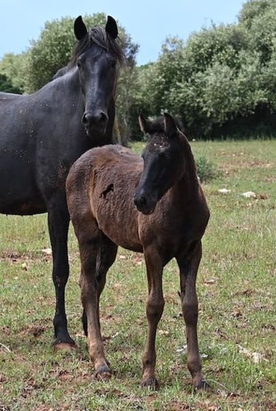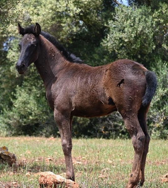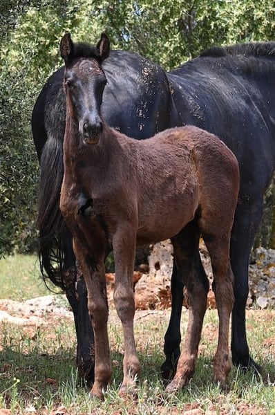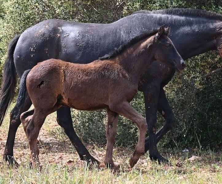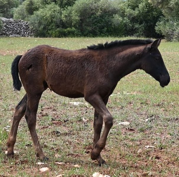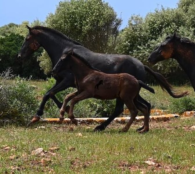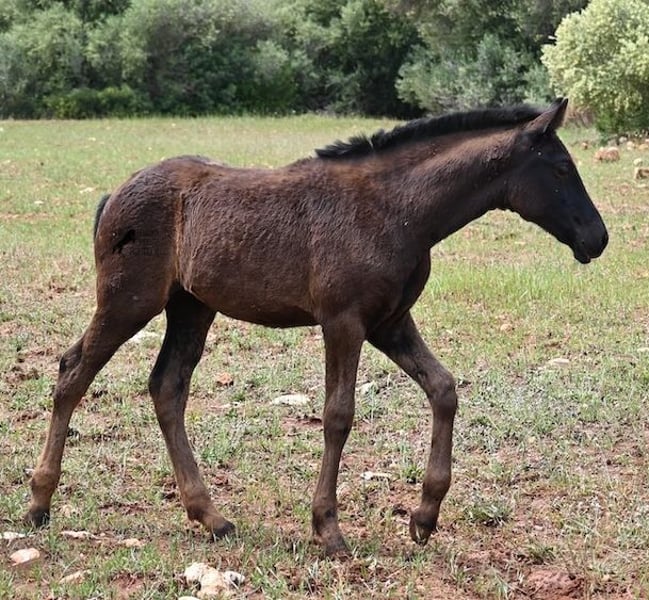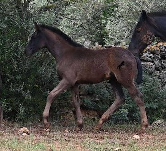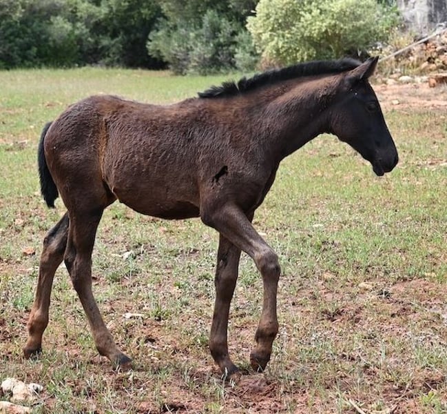 This purebred Menorquin filly, born in February 2025, is already a little baroque beauty :) She is still very much oriented towards her mother but is very open-minded and increasingly daring to explore the world on her own. Apart from a tiny star on her forehead, she will be completely black like her mother, and this black coat is already shining through her fluffy foal coat! Her mother is over 170 cm tall and is the daughter of a RECOMENDADO stallion, who has been awarded for his outstanding dressage performances. The father of this young lady has been multiple times the best stallion of the breed and carries old lines of the Menorquin. She lives 24 hours in a robust environment, regardless of the weather – even in the rain, as was the case the day before, which is why they were all a bit muddy ;) She is still completely unhandled but will be well halter-trained for transport. She already has her passport, so she can travel to your home in the summer after weaning. If you wish to pick her up later, a raising place can be organized for her. Videos available upon request. Her location is Menorca. I can gladly organize a foal vet check, transport, or her journey if you would like to come in person to see her. Details can be found on my page or in conversation. Greetings from Spain!