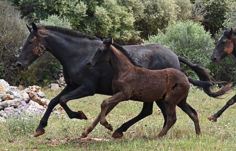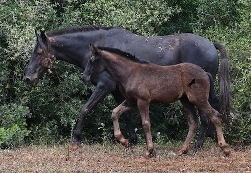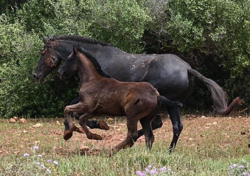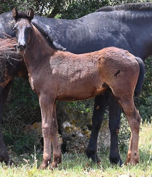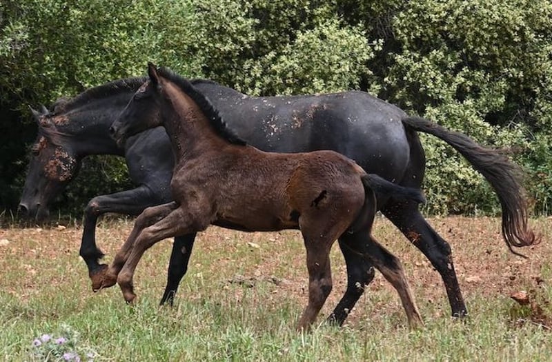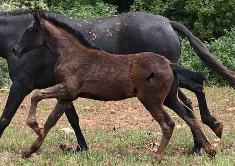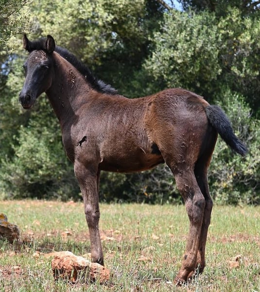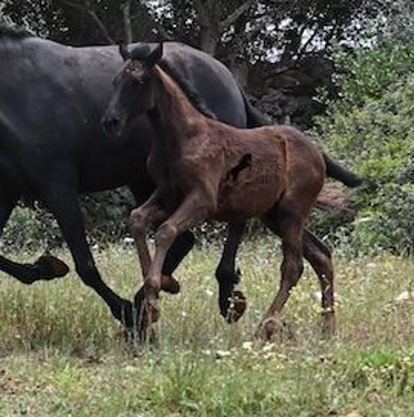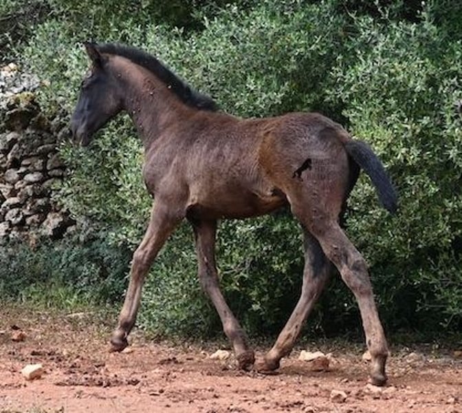 This purebred Menorquin filly, born in February 2025, is already a little baroque beauty :) She is still very much oriented towards her mother but is very open-minded and increasingly daring to explore the world on her own. Apart from a tiny star on her forehead, she will be completely black like her mother, and this black coat is already shining through her fluffy foal coat! Her mother is over 170 cm tall and is the daughter of a RECOMENDADO stallion, who has been awarded for his outstanding dressage performances. The father of this young lady has been multiple times the best stallion of the breed and carries old lines of the Menorquin. She lives 24 hours in a robust environment, regardless of the weather – even in the rain, as was the case the day before, which is why they were all a bit muddy ;) She is still completely unhandled but will be well halter-trained for transport. She already has her passport, so she can travel to your home in the summer after weaning. If you wish to pick her up later, a raising place can be organized for her. Videos available upon request. Her location is Menorca. I can gladly organize a foal vet check, transport, or her journey if you would like to come in person to see her. Details can be found on my page or in conversation. Greetings from Spain!