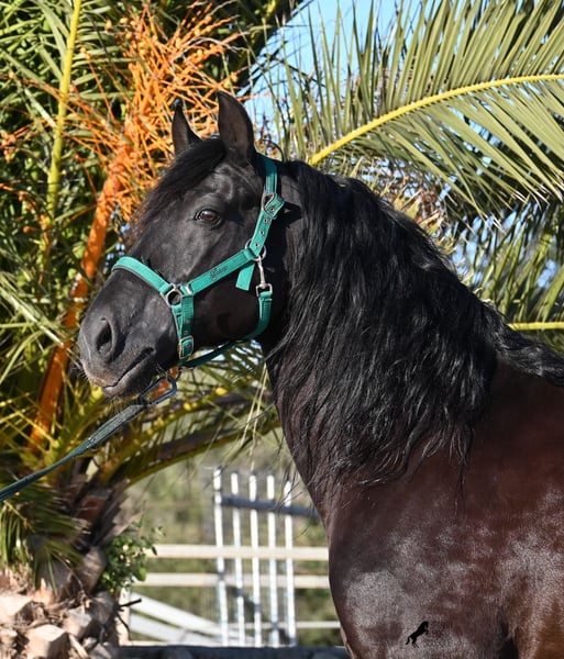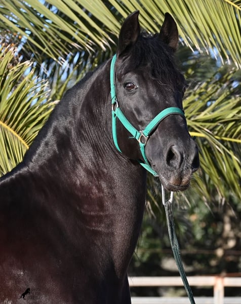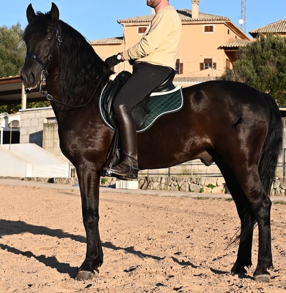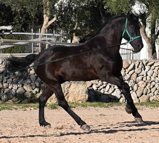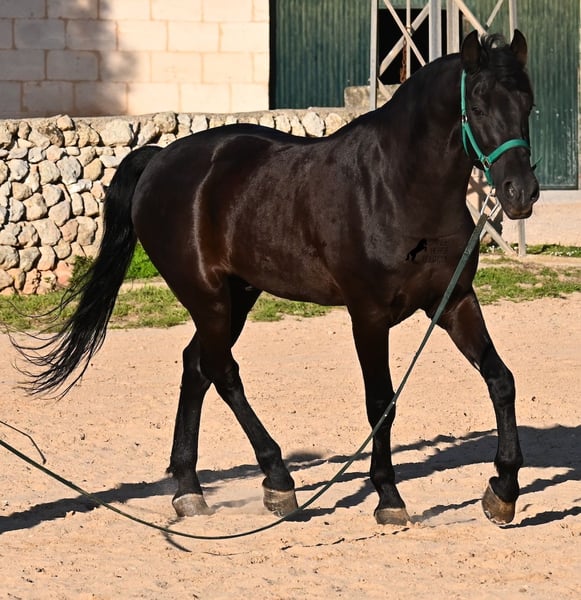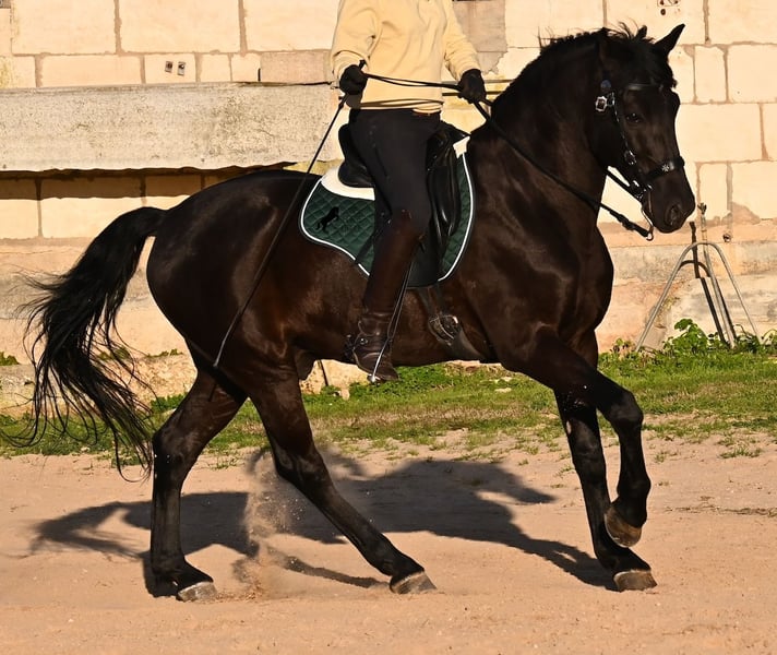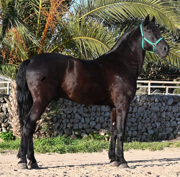 Dieser 2014 geborene, reinrassige Menorquinhengst, hat so einiges zu bieten! Er ist in jeder Situation absolut sicher und im Gelände klettert er über felsige Abschnitte, in stoischer Ruhe. An der Hand ist er sehr brav und immer aufmerksam bei seinem Menschen. Geritten ist er in der örtlichen typischen Doma Menorquina (Einhändig), sowie klassisch englisch. Ihn bringt wirklich nichts aus der Ruhe, denn er hat sowohl Showerfahrung, wo er mehrfach in einer Hengstquadrille aufgetreten ist und mehrfache Fiestaerfahrung. Kurzum, ein bombensicheres Pferd! Unterm Sattel beherrscht er laterale Lektionen, den spanischen Schritt und den typischen BOT der Menorquin (Laufen auf der Hinterhand)- doch keine Sorge, wer das nicht mag, er macht es nur auf Abruf und nicht als "Überraschung". Sein Charakter ist sehr ruhig und das merkt man auch beim Reiten. Jede Woche geht es mindestens einmal ins Gelände, alleine oder mit Anhängerfahrt zu einem stundenlangen Gruppenausritt! Er ist also verladefromm und geländesicher auf allen Untergründen, alleine sowie in der Gruppe. Seine schöne, barocke Halsung und die natürliche Welle in der Mähne, stechen sofort ins Auge. Seine Schönheit hat er schon mehrfach unter Beweis stellen dürfen, denn auch modeln für internationale Fotografen, gehört zu seinem Repertoire. Auch da ist er an der Hand über Felsen geklettert, um an gute Spots zu kommen, ist stoisch gestanden ohne Gezappel und eines der Bilder von ihm hat sogar einen internationalen Fotowettbewerb gewonnen. In einem Menorquinkalender 2026 ist er auch vertreten (Bestellung vom Kalender über mich möglich!). Abstammen tut er ganz alter Urlinien des Menorquin und diese Pferde zeichnen sich durch ihre Ausdauer, ihren Mut und ihre Treue aus- alles Punkte die er auf jeden Fall erfüllt. Er ist 166cm, gekört und hat keine weißen Abzeichen, wie es das Zuchtziel wünscht. Die Abendsonne lässt ihn etwas heller erscheinen, aber er ist definitiv ein Rappe, wie es ein Menorquin sein soll. Wer keinen Hengst halten kann/möchte, für den besteht selbstverständlich die Option der Kastration vor Ort. Es wurden 01/2026 Röntgen von ihm gemacht, die gerne zur Verfügung gestellt werden. Ein wahres Juwel an Pferd mit gutem Charakter und auch Showpotenzial. Preis der Qualität entsprechend! Sein Standort ist Menorca. Videos und Abstammung gerne auf Anfrage. Gerne organisiere ich vor Ort eine AKU, Beritt, Kastration, Transport oder auch ihre Reise, sollten Sie persönlich zum Anschauen kommen. Details dazu gerne auf meiner Seite oder im Gespräch. Saludos aus Spanien