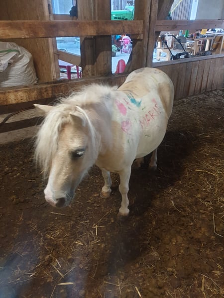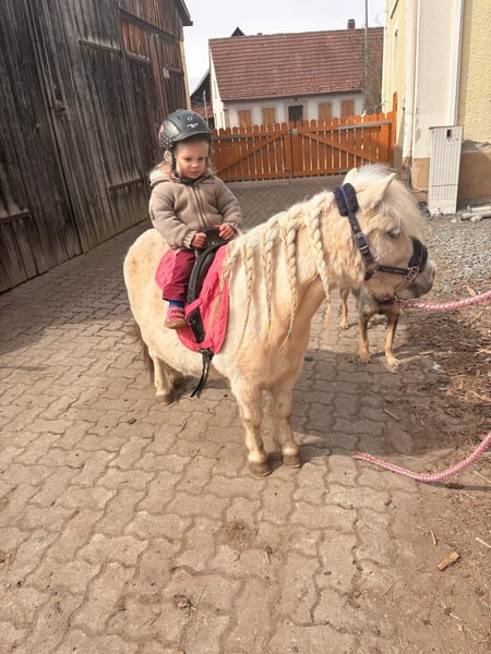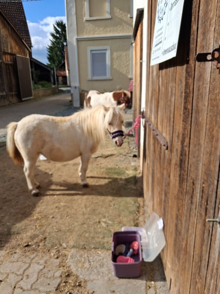 Die kleine Ria von Wolfachtal, liebevoll Mariechen genannt, sucht einen neuen Möhrchengeber! Mariechen hat volle Papiere und ist für die Zucht hochinteressant! Sie ist ein wunderschöner Palominoschecke mit edlem Gesicht. Ihre Gänge sind für ein Shetty sehr raumgreifend. Sie ist 85 cm hoch und wird hier von meiner 6 jährigen Tochter gerne geritten. Wir haben sie im Sommer 25 angeritten, durch das Wetter hatte sie etwas Pause. Das Mariechen wird im April 9 Jahre alt. Beißen und treten sind für das Mariechen Fremdwörter. Sie ist eher schüchtern und sensibel und braucht etwas, um ihrem Menschen zu vertrauen, daher wünschen wir uns für sie auch eine einheitliche Bezugsperson. Wechselnde kleine Reiter findet sie ok. Für mehr Infos gerne PN!