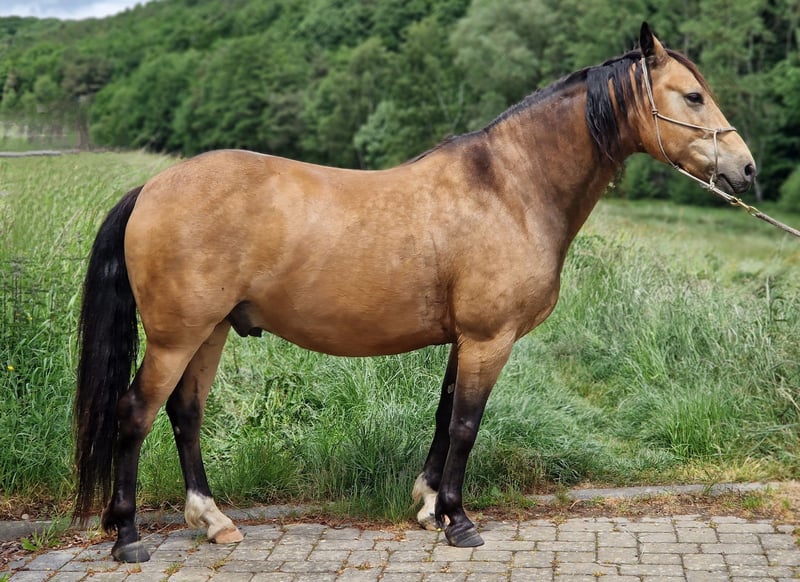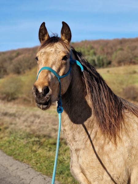 White Clouds Cisco Buckskin mit Bronze Schimmer, ein Traum für alle Disziplinen. Bisher viel im Schritt, Walk, Trab und Gallop im Gelände geritten. Dieser coole Wallach ist jetzt bereit für neue Abenteuer ! Er braucht einen Reiter mit einer ruhigen Hand, Gelassenheit und jemanden der ihn Altersgerecht fördert, weiter ausbildet und Abwechslung bietet. Er ist : trittsicher geländegängig ausdauernd mutig selbständig robust stabil kurz im Rücken arbeitswillig Menschenbezogen neugierig Gesund lernt schnell Sehr feinfühlg in Bodenarbeit Grundausbildung beim Horsemen Trainer Michael Rieser November/Dezember 2024 beim Gangpferde Trainer Vierhaus (@ Fotos von Ellen Vierhaus) Zur weiteren Ausbildung und Ausbau des Flatfoot Walk CISCO ist ganzjährig Weidehaltung mit Offenstall gewöhnt, kennt Box vom Trainer und er soll weiterhin in artgerechte Offenstall Haltung mit genügend Auslauf. natürlich entwurmt und geimpft und Zähne gemacht