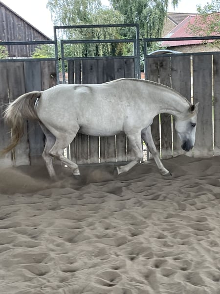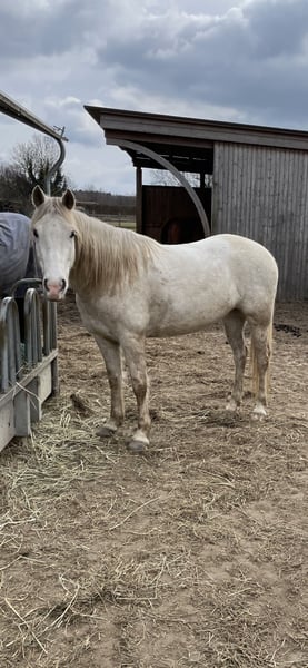 **Verkaufsanzeige: Missouri Foxtrotter Stute** Wir verkleinern unsere Stutenherde. Daher steht eine wunderschöne Missouri Foxtrotter Stute, geboren im Jahr 2020 zum Verkauf. Mit einem Stockmaß von 151 cm hat Pearl eine ideale Größe für Frauen oder fortgeschrittene Jugendliche fürs Freizeit- und Geländeritte. Aufgrund ihres Alters könnten da noch 1 oder 2 cm dazukommen Pearl besticht durch ihr weißes Fell, viel Behang und ihren charmanten Charakter. Sie erscheint Schneeweiss, ist aber aber kein normaler Schimmel. Sie wurde weiss geboren, da sie ein Cremegen hat. Sie hat dunkle feste Hufe und dunkle Haut. Sie hat natürlich veranlagte rassetypische Gänge und ist butterweich zu reiten. Sie ist sowohl im Umgang als auch unter dem Sattel sehr brav und lernwillig. Da sie bereits mit dem zweiten Fohlen trächtig ist, ist sie nicht so viel wie andere gleichaltrige geritten. Sie kennt es auf dem Platz und im Gelände rgeritten zu werden. Sie ist für 2026 trächtig von Pawnees old Buck. Das Fohlen wird somit mit großer Wahrscheinlichkeit laut Farbgenetic ein Buckskin oder ein aufgehellter Bucksskin werden!! Sie erwerben also zwei wunderschöne Pferde auf einmal. Egal, ob Sie ein erfahrener Reiter sind oder gerade erst mit dem Foxtrotterreiten beginnen – diese Stute wird Sie mit ihrem sanften Wesen begeistern. Bei Interesse oder weiteren Fragen stehe ich Ihnen gerne zur Verfügung. Besuchen Sie uns und lernen Sie diese außergewöhnliche Stute persönlich kennen! Anfragen gern per Whatsapp 01775342261