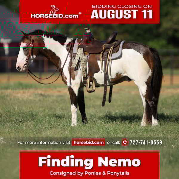 ⚜ The HERITAGE Classic ⚜ Happening now thru MONDAY | AUGUST 11th - Available EXCLUSIVELY on HorseBid's website! For more details and to register visit: www.Horsebid.com CONSIGNOR CONTACT: Ponies & Ponytails 727-741-0559 LOCATION: Cleburne, TX BREED: Pony REGISTERED: No REGISTERED NAME: Nemo COLOR: Bay Overo HEIGHT: 11.2 AGE: 10 GENDER: Gelding Kid tested! Mother approved!! Finding Nemo is the fanciest 10yr old 11.2h loud bay and white gelding. This is the most amazing pony! From the trails to the buggy you cannot go wrong with Nemo! Nemo started his life in the show ring. He was shown in hand and under harness. He was a 2x champion driving pony! After his show life Nemo has just been a lovable family pony! He rides English, western, bareback, front ways, sideways and backwards! Nemo has dabbled around in the little rodeo events running the barrels and poles. This little man can fly!! The older kiddos can take him fast then you can immediately pop the little kiddos on his back and he will just ease right along with them! Nemo has also been started roping the dummy. He’s very good on the heel side with a great little stop and neck rein! If you want a fancy English pony he will do that also! He’s got the cutest little trot and canter! He catches both leads AND he does lead changes!! How cute is that?! Nemo is also a little crossrail champ! He has schooled up to 18” verticals with the cutest little knees and plenty of room up!! If all you want is a safe trail pony.. Nemo is also a perfect gentleman for that as well! Even the little kiddos can load and unload him with ease. He’s extremely quiet in new places. Doesn’t get silly or spooky about anything. He will ride anywhere in the group of horses as well. He will also pony behind the big horses for the little kiddos. Nemo is such an amazing pony on the trails. Over the biggest hills, down the steepest cliffs, he rides out in open fields, he rides in deep woods and he goes right into the water!! Nemo has the most wonderful loving disposition! He loves people and attention. He comes to you in the pasture and puts his little head right in the halter! He’s very quiet In the barn or in the pasture. He’s gets along with mares and geldings. Turn him out alone or in a herd. Nemo is an easy keeper with no special diet. He’s just eating alfalfa hay. From the little kiddos learning how to ride up to the bigger kiddos wanting the most fancy pony out there.. Little Nemo is sure to steal the hearts of everyone in the barn! Please feel free to reach out with any questions or to schedule a time to come meet this amazing pony!!
