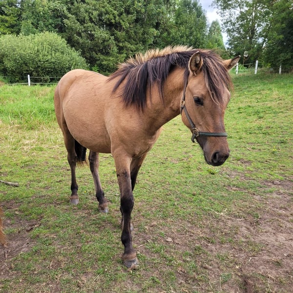 Cookie is registered as a German buckskin. At first glance, he stands out with his unusual grey-golden coat and beautiful eyes. His sire, Champ de Lux, is an elite stallion who has passed on Cookie’s expected pony-sized height as well as his willingness to work. Cookie is exceptionally friendly and has been easy to handle since a young age, whether leading, loading, or during hoof care. Due to age, we are very reluctant to part with our buddy and are looking for new owners who have experience in backing and are seeking a reliable, fearless, and well-behaved large pony.
