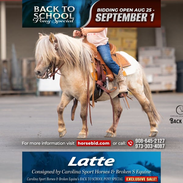𝐂𝐚𝐫𝐨𝐥𝐢𝐧𝐚 𝐒𝐩𝐨𝐫𝐭 𝐇𝐨𝐫𝐬𝐞𝐬 & 𝐁𝐫𝐨𝐤𝐞𝐧 𝐒 𝐄𝐪𝐮𝐢𝐧𝐞'𝐬 📚𝑩𝒂𝒄𝒌 𝒕𝒐 𝑺𝒄𝒉𝒐𝒐𝒍 𝑷𝑶𝑵𝒀 𝑺𝒑𝒆𝒄𝒊𝒂𝒍📚 Happening now thru MONDAY | SEPTEMBER 1st - Available EXCLUSIVELY on HorseBid's website! For more details and to register visit: www.Horsebid.com CONSIGNOR CONTACT: Carolina Sport Horses & Broken S Equine Kieran 908-645-2127 or Beau 573-303-4087 LOCATION: Clover, SC BREED: Miniature REGISTERED: No COLOR: Appaloosa HEIGHT: 36” AGE: 5 GENDER: Gelding Latte is a 5 year old miniature pony gelding standing 36 inches tall. Latte was born and raised at a family friends farm. There he was ridden and driven by all of their kids, ridden around livestock, and loved on by everyone in the family. When their kids all outgrew him, we were thrilled to be able to bring him to our farm for all of our kids to enjoy and bring along for our Pony Special. Latte has paraded the kids through town, on the trails, and through trail obstacle courses. He’s sure footed, cute as a button, and gentle as a lamb. Latte loves to get out and explore. He crosses creeks, logs, and rocky terrain like he’s a big horse! We can pony the little ones on him off of our horses, or let them steer him around themselves. He doesn’t worry about his surroundings, and will carry on without care in any situation. He’s also broke to drive, and will go anywhere you point him! If you want a pony that loves attention, Latte is your man. He’s a huge fan of being the center of attention, and usually is due to how cute he is! He loves being groomed and preened, and strutting his stuff in the pasture afterward. Latte lives out with mares and geldings, and is an easy keeper with no vices or maintenance. Clean recent vet check on file