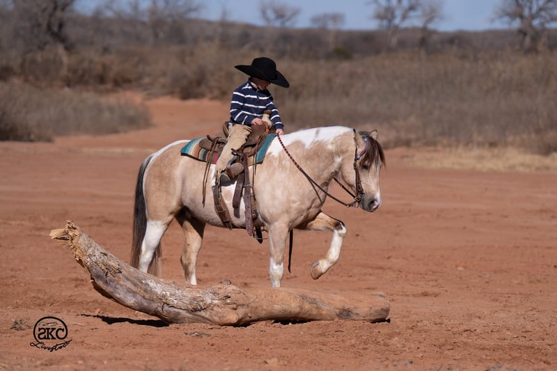 🎄𝐓𝐇𝐄 𝑯𝒐𝒍𝒊𝒅𝒂𝒚 𝐂𝐋𝐀𝐒𝐒𝐈𝐂🎄 Happening now thru MONDAY | DECEMBER 15th - Available EXCLUSIVELY on HorseBid's website! For more details and to register visit: www.Horsebid.com CONSIGNOR CONTACT: SKC Pony Collection 806-282-7093 or 785-531-2353 LOCATION: Canyon TX BREED: Pony REGISTERED: No COLOR: Buckskin and white tobiano HEIGHT: 12.3 AGE: 5 GENDER: Gelding If you could design the perfect pony from scratch, he would look and act exactly like Theodore. Standing a precious 12.3 hands tall, this buckskin-and-white gelding is truly one of the cutest, kindest, and most trustworthy ponies on planet earth. Theo lives up to his name in every way—soft, gentle, polite, and carrying a quiet old-soul spirit that instantly settles both children and parents. Beautifully and exquisitely trained, Theodore moves like a little show horse—floaty, balanced, and responsive—yet he stays simple, steady, and confidence-building for even the youngest or greenest riders. He’s the rare pony who makes parents feel at ease and kids feel unstoppable. His personality? If you could hand-pick every perfect trait and mold it into one pony… you’d get Theo. One of Theodore’s most adored features is that he’s trained to curbside mount. Even the smallest kids feel independent when they can cluck to him and he quietly side-passes over to the mounting block, the fence, or whatever rock they’ve found out on the trail. He wants to help them succeed—every single time. He is as versatile as he is trustworthy. Theo crosses water, rocky terrain, and anything else he encounters with calm confidence. He’s proven safe with unexpected wildlife and just as steady with the chaos of everyday ranch life—dirt bikes, skid loaders, trains, busy roads, barking dogs, you name it. He’ll ride off alone just as happily as he will with a group—nothing changes his easygoing demeanor. He’s even accustomed to gunfire and pays no mind to it. Around home, he’s a valued partner. Our kids hop off the school bus, slide on his back bareback, loop nothing more than a little string around his neck, and guide him absolutely anywhere they want to go. He’s happy to stroll the pastures, check cows, explore new terrain, or simply stand tied like the world’s cutest yard ornament. He’s also proven he can do just about anything the kids dream up. Our 8-year-old has taught him to go English, and he looks absolutely adorable loping around in an English saddle, stepping through trot poles, and even popping over little jumps with perfect rhythm and a big-hearted willingness. Theo is easy to catch, endlessly patient, and carries impeccable manners that set him apart. He’s a joy to handle, a blast to ride, and the kind of pony who is always ready for the next adventure—no warm-up, no drama, no fuss. Whether your family needs a starter pony for tiny beginners or a fancy, safe, competitive partner for a kid ready to step into the show ring, Theodore is absolutely that pony. He meets every child where they are and helps them shine. Ponies like Theodore aren’t made—they’re heaven-sent. A once-in-a-lifetime partner wrapped in an adorable buckskin and white package. Please call Cheyenne or Saylor with any questions. 806-282-7093