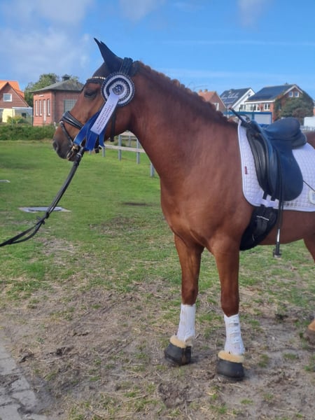Pinot Noir - bei uns "Pino" - ist ein wunderschöner Ponywallach mit viel Charme und einem Herz aus Gold. Er ist 2020 geboren und ist aktuell 1,45m groß und bleibt damit auch sicher im Maß. Er hat 3 gute Grundgangarten, wobei besonders sein bergaufgesprungener Galopp hervorzuheben ist. Pino wurde von mir als Amateur 4 jährig schonend angeritten und bisher vor allem Dressurmäßig gefördert. Letztes Jahr konnte er sich mehrfach in A* und A** Dressur vorne platzieren - mit Noten bis 8,0. Ich habe ihn diese Saison auch schon in L* vorgestellt. Er ist ein liebes Pony, welches sich immer bemüht die Hilfen des Reiters richtig umzusetzen. Er läuft in der Abteilung problemlos vorne und hinten und kennt es auch mit Ausbindern geritten zu werden. Er ist allerdings nicht Anfänger geeignet und benötigt einen ruhigen Reiter, der einen gefestigten Sitz hat (so Dressurreiter-WB Niveau). Ich kann ihn mir durchaus auch für ein sicher reitendes Kind vorstellen mit entsprechender Hilfe. Ebenso wäre er natürlich auch für kleine Erwachsene geeignet. Weiteres dazu gerne im persönlichen Gespräch. Er geht inzwischen - auch alleine - super artig ins Gelände. Weiterhin war ich mit ihm letztes Jahr auch am Strand auf Norderney, wo er sogar erfolgreich Turnierprüfung gelaufen ist. Im Springen wurde er bisher noch nicht weit gefördert, er kennt Stangenarbeit und Cavalettis und kleine Kreuze, dies absolviert er zuverlässig. Im Umgang ist er ein absoluter Schatz, sehr liebenswürdig und absolut artig und unkompliziert. Er ist schmiedefromm (aktuell vorne beschlagen) und verladefromm (geht alleine auf den Anhänger). Ich kann ihn mir daher sehr gut für jemanden vorstellen, der in den Turniersport einsteigen möchte, da er super unkompliziert und brav auf Turnier ist, auf dem Anhänger steht wie ne Eins und sich super Verladen lässt etc. Er klebt nicht und kennt es auch alleine zu bleiben. Aktuell steht er nachts in der Box und tagsüber den ganzen Tag draußen, ich könnte mir ihn ebenso aber auch im Offenstall vorstellen. Bei mir steht er in Wallachgesellschaft und zeigt sich hier sehr sozial, rangniedrig und verspielt. Er ist natürlich regelmäßig geimpft und entwurmt und Zähne wurden gemacht. Bei mir war er immer gesund und zeigt sich sehr robust. Er steht korrekt auf den Beinen und hat ein gutes, stabiles Fundament. Ich gebe dieses absolute Traumpony nur in allerbeste Hände! Ich habe keinen Verkaufsdruck und wünsche mir ein tolles - am liebsten Für immer-Zuhause mit guter Haltung für Pino, wo er weiterhin gefördert, geliebt und wertgeschätzt wird. Platz vor Preis! Sein Zubehör (Passier Sattel, Trense, vers. Horseware Decken) kann bei Interesse gerne mitübernommen werden.
