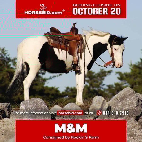 ♦️ 𝐭𝐡𝐞 𝐀𝐌𝐄𝐑𝐈𝐂𝐀𝐍 𝓕𝓪𝓵𝓵 𝓒𝓵𝓪𝓼𝓼𝓲𝓬 ♦️ Happening now thru MONDAY | OCTOBER 20th - Available EXCLUSIVELY on HorseBid's website! For more details and to register visit: www.Horsebid.com CONSIGNOR CONTACT: Rockin S Farm 814-810-7918 LOCATION: Rebersburg PA BREED: Pony REGISTERED: No COLOR: Black and white paint HEIGHT: 11 AGE: 7 GENDER: Gelding 🔥🔥M&M🔥🔥 Here's a jaw dropping gorgeous colored medicine hat overo Paint pony gelding that is very well broke to ride and drive and safe for the children to play with and have fun on , the children have ridden him all around the farm and helped check cattle and fences, he's also a seasoned trail pony and will ride out alone or with a group, he is not barn or buddy sour, he will ride through creeks and over logs wherever you point him. M&M is also a solid driving pony and has been taking the children to school on the main road, he is traffic safe and not spooky from loud traffic or big semi's. M&M also rides well in the arena and will let the children ride double and play around with a tarp or bounce ball We've taken him to state parks on trail rides and he hauls and trailers great , he'd be an excellent choice if you’re looking for one that the children can ride along on the family trail ride with and be confident, M&M sells 100% sound and requires no maintenance, he has no founder issues and is a healthy guy, he up-to-date on farrier and dewormer and has a current coggins and health certificate If You have any questions please feel free to call Sam 814-810-7918 We are happy to assist arranging in transportation anywhere in the US
