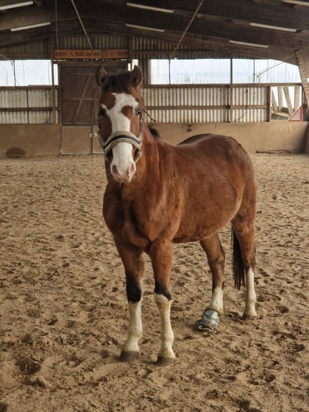 Super süßer und vorallem auffälliger Ponywallach sucht hier sein Perfect Match!! Vuitton (bei uns Louis) ist vor einigen Monaten als Projekt-Pony zu uns gekommen und seither schonend angeritten worden. Immer wieder durfte er viele Pausen machen um das gelernte zu verarbeiten und um körperlich an seine neuen Aufgaben heran zu wachsen. Er lässt sich bereits am längeren Zügel (nach vielen Probereiten auf Jundpferden der letzten Jahre möchte ich einmal an die Skala der Ausbildung erinnern - dieses Pony ist noch nicht in der Anlehnung angekommen!) in allen Gangarten durch die Halle aber auch auf dem Außenplatz arbeiten. Wir sind aktuell immer noch mit einer Helfenden Person zum Aufsitzen und ggf. Nachtreiben (was kaum mehr nötig ist) in der Halle anwesend. Louis ist sehr bemüht alles richtig zu machen, möchte gefallen, ist total brav und geduldig. Wir sehen ihn im Freizeitsport, auf WBO oder kleineren LPO Turnieren oder auch sehr viel im Gelände und glauben, dass man mit ihm sehr viel Spaß haben wird. Kürzlich hatte Louis ein fieses Hufgeschwür welches nun ausgeheilt ist -ihm aber eine längere Stehpause und somit leider etwas der hart erarbeiteten Muskulatur gekostet hat. Wir haben letzte Woche wieder die Arbeit aufgenommen. Durch mein Baby muss ich mir eingestehen, dass ich deutlich weniger Zeit finde als gedacht und mir diese zusätzliche Belastung der Jungponyarbeit gerne etwas reduzieren würde. Louis ist daher entgegen unserer Pläne schon jetzt zu verkaufen aber ist kein Notverkauf! :) Kennenlernen und Probereiten für 20 EUR gerne möglich, werden beim Kauf verrechnet. Wir wollen grade dieses noch in Ausbildungstehende Pony so vor Reittourismus schützen.