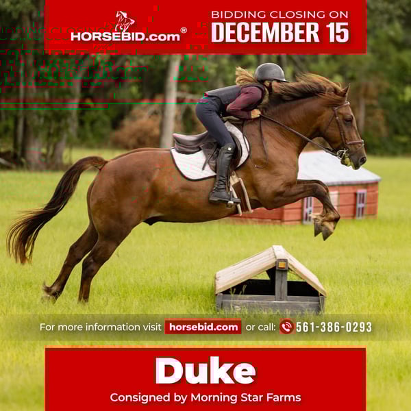 🎄𝐓𝐇𝐄 𝑯𝒐𝒍𝒊𝒅𝒂𝒚 𝐂𝐋𝐀𝐒𝐒𝐈𝐂🎄 Happening now thru MONDAY | DECEMBER 15th - Available EXCLUSIVELY on HorseBid's website! For more details and to register visit: www.Horsebid.com CONSIGNOR CONTACT: Morning Star Farms 561-386-0293 LOCATION: West Palm Beach, FL BREED: Draft Cross Pony REGISTERED: No COLOR: Sorrel HEIGHT: 14.2 AGE: 7 GENDER: Gelding Are you looking for your next equine best friend? Meet Duke, a 7-year-old, 14.2h draft cross pony. Duke brings a whole lot of heart and talent in a compact, versatile package. From swinging a rope to schooling dressage, clearing jumps, cruising the trails, or riding Western — Duke has done it all. He’s even carried kids in summer camp leadline and tackled bridleless jumps like a pro. Yes, he can even be ridden bareback with ease! He’s got a sweet soul and truly enjoys having someone to love on him. He is as "Steady Eddie" as they come, packing around riders of all ages and skill levels from age 6-72! He really knows how to meet his rider where they are — as long as they can give him just enough structure to shine. Duke would best flourish with a confident rider to continue his training, but he has also shown how well he does just getting pulled out as a "play horse" for fun days at the farm! He thrives with a job and does best in a consistent program, though he’ll never turn down a play day or a little extra attention. With his lovable personality, all-around experience, and flair for fun, Duke is ready to be someone’s next dependable — and delightfully versatile — partner.