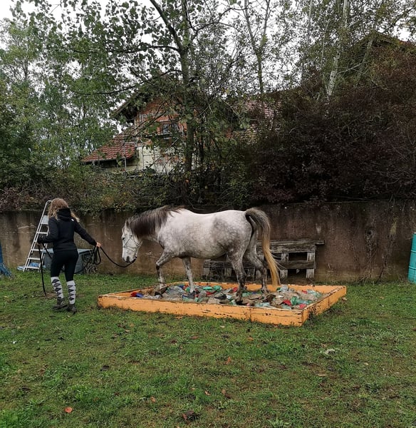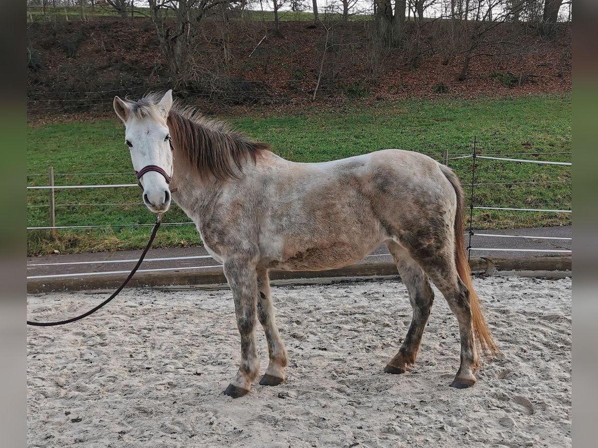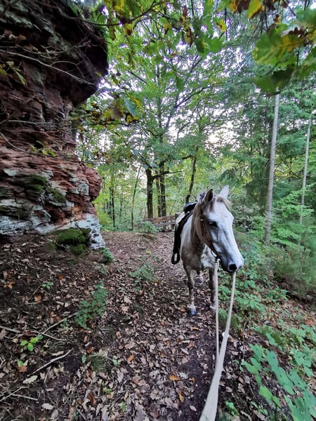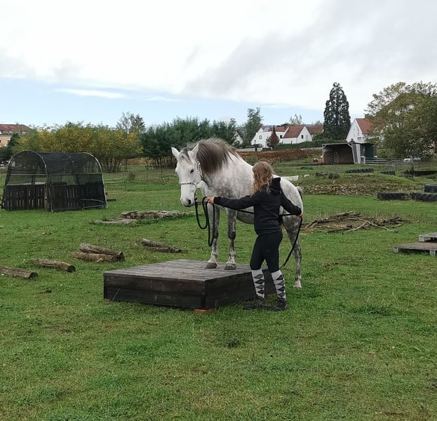 Stute 9 Jahre Stockmaß ca 1,40 m Geritten und gefahren Sie ist geritten, hauptsächlich allein im Gelände. Kennt aber auch Platz und Halle, sowie Gelassenheitstraining, Bodenarbeit oder extrem Trail und das macht sie auch alles wirklich großartig. Sie ist sehr unerschrocken. Im Gelände fragt sie schon mal ob sie den Weg bestimmen darf, deswegen würde ich sie nicht als reines Anfängerpferd sehen. Wer aber Unterstützung dabei hat oder einfach konsequent ist, wird das gut schaffen. Sie ist bei uns noch nie durchgegangen. Sollte sie wirklich mal unsicher sein, bleibt sie stehen. Ich finde sie besonders toll, wenn sie von Kindern oder Jugendlichen geritten wird. Dafür eignet sie sich hervorragend. Auch erwachsene Reiter/innen bis 1,70 m und 70 kg sind kein Problem, das schafft sie gut. In der Herde ist sie eher rangniedrig. Sie ist brav beim Tierarzt, Hufschmied und Hänger fahren. Sie kennt Hunde (die dürfen sogar unter ihrem Bauch durchlaufen), Katzen, Hühner, Kühe, Ziegen, tobende Kinder, Traktoren, Motorsäge, Feuer uvm. und zeigt sich dabei recht gelassen. Gefahren ist sie auch, allerdings nicht bei uns. Da ich sie aber beim Kennenlernen damals selbst gefahren bin, kann ich das mit Sicherheit sagen. Hier wurde sie ausgebildet von einem professionellen Trainer im Elsass, der viele nationale und internationale Titel hat. Sie hat einen Westernsattel und wird freizeitmäßig geritten (kann auf Wunsch auch gekauft werden). Aktuell geht sie Barhuf und steht im Offenstall. Im Sommer 24/7 auf der Koppel.