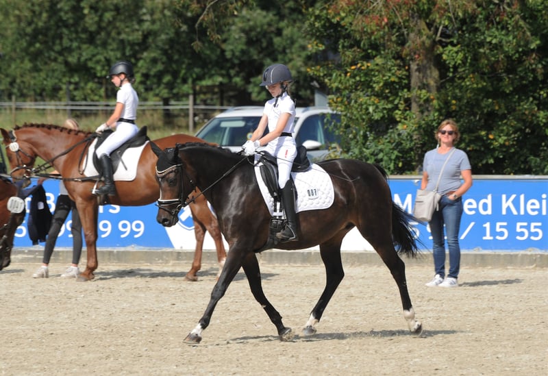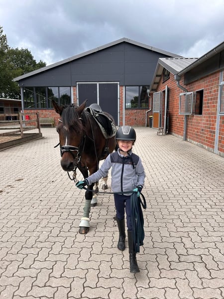 Sehr brave, erfahrene und zuverlässige 15-jährige dunkelbraune Ponystute, Größe 1,48 m. Rainbow Angel ist sehr gut ausgebildet und startete auf Turnieren in der Dressur bis M*. Auch am Sprung zeigt sie sich talentiert - wurde auf Turnieren aber nur in der Dressur vorgestellt. Sie hat sehr gute Bewegungen, kennt auch Wechsel und ist problemlos im Umgang, so dass Kinder gut mit ihr klar kommen. Sie begleitete zwei unserer Enkeltöchter beim Reitunterricht und wurde von den Mädchen auch auf Turnieren vorgestellt - vom Reiterwettbewerb über die Jugendreiterprüfung bis zur Klasse A. Auch bei Ausritten und im Gelände zeigte sie sich stets von ihrer besten Seite. Die Stute ist fit und gesund und sofort einsatzbereit. Sie kennt den Transport auf Anhängern, lässt sich leicht - auch von Kindern - verladen und ist brav beim Hufschmied. Ein TÜV wurde vor etwa zwei Jahren gemacht. Es gab keine besonderen Auffälligkeiten.