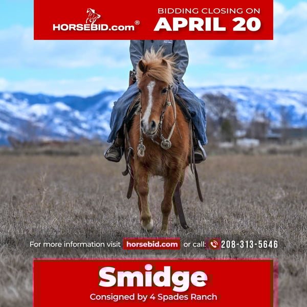 ⚜️𝐭𝐡𝐞 𝓔𝓵𝓲𝓽𝓮 𝐒𝐩𝐫𝐢𝐧𝐠 𝐂𝐥𝐚𝐬𝐬𝐢𝐜⚜️ Happening now thru MONDAY | APRIL 20th - Available EXCLUSIVELY on HorseBid's website! For more details and to register visit: www.Horsebid.com CONSIGNOR CONTACT: 4 Spades Ranch 208-313-5646 LOCATION: Rigby, ID BREED: Pony REGISTERED: No REGISTERED NAME: Smidge COLOR: Sorrel HEIGHT: 43 AGE: 4 GENDER: Mare Smidge is a coming 4-year-old sorrel pony mare standing right at 43 inches tall, and she is built the way everyone is looking for—thick made, clean-headed, and carrying that big hip that gives her both presence and power. This mare is the definition of a true all-around pony. Smidge rides, drives, ropes, and confidently tackles trail courses and obstacles. She will lay down on cue, handle gunfire without hesitation, and step into just about anything you ask of her with a willing, steady mindset. She has been a key partner for our youngest son, Stillman, who campaigned her in the 2026 Teton Horse Experience Pony Project, where they were crowned Champion of the 7–9 division. That experience alone speaks volumes about her disposition, trainability, and reliability for a youth rider. Smidge has been exposed to real ranch life, playtime chaos, and structured training—and she handles it all with a quiet confidence and a kind, forgiving nature. She is the type of pony that not only takes care of her rider but also helps them grow. If you’re looking for a versatile, broke, and dependable pony with all the buttons—and the mind to match—Smidge is one you won’t want to miss. Watch her video and see for yourself all the fun adventures she’s been a part of.