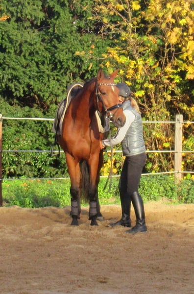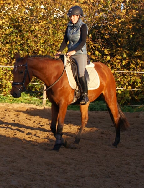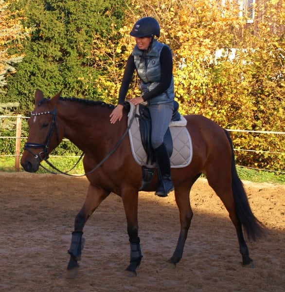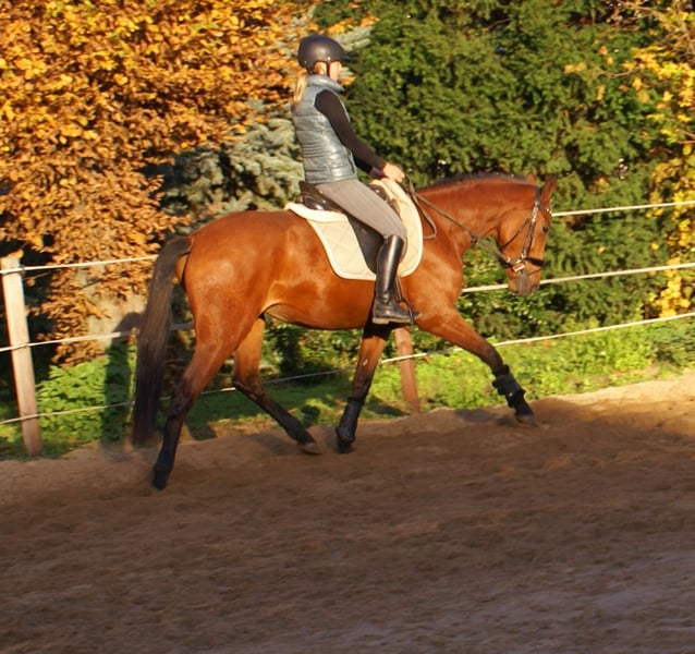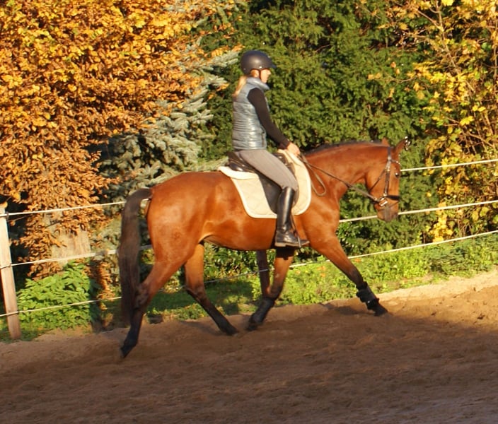 Schöne braune Stute, in den GGA sicher und unaufgeregt zu reiten, nicht schreckhaft, viel Potential in der Bewegungsqualität, lieb im Umgang, nicht stutig, Pass ohne Abstammung