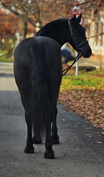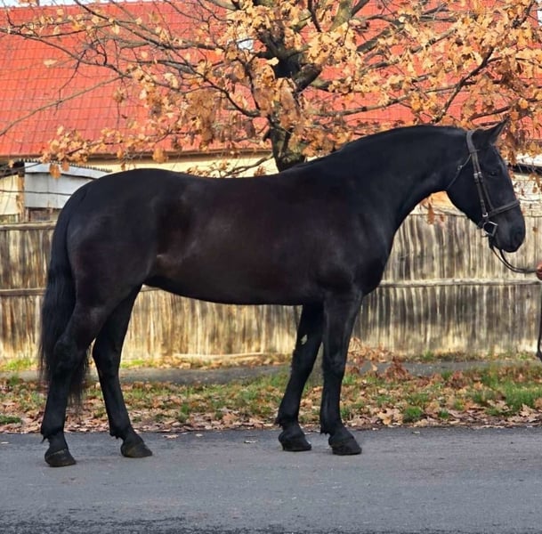 Dalma is a 7-year-old, 15.5 hh black mare who immediately captures attention with her elegant appearance and calm demeanor. She is not only visually harmonious but also impresses with her balanced and steady temperament. Her nature is particularly calm and attentive. Dalma is extremely well-trained, respectful in her interactions with people, and consistently reliable in everyday situations. She adapts quickly to new environments, remains relaxed without becoming nervous or anxious, and always maintains her composure. This mental stability provides a high level of confidence for everyone working with her. Under saddle, she is cooperative and offers the rider a very pleasant riding experience. She responds sensitively to aids, works evenly and calmly, making riding a pleasure rather than a chore. Whether in the arena or out on the trails, Dalma remains composed and easy to control. In daily handling, she is exemplary. She is calm and patient when grooming, tacking up, and leading, with no bad habits. She is cooperative with the farrier and during loading, which clearly reflects her excellent training. Dalma is the ideal choice for anyone seeking a well-mannered, calm, and reliable mare. A horse that not only provides safety but also brings genuine calmness and harmony to everyday riding life.