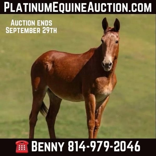 ONLINE AUCTION Place your bids at www.PlatinumEquineAuction.com Starting Bid $3500 Auction ends September 29th, 2024 Need a new saddle? Check out White Rock Saddles on our website or Facebook! Meet Clifford… If you’re looking for a stout made John mule that’s an absolute saint, look no further. Clifford stands 15.1hh and is one handsome mule at just 13 years old he is truly in his prime. He’s been a trail mule his whole life but he can ride around the arena just as nice, taking his leads moving through transitions and guiding around one hand with a great stop- all in just a snaffle. He stands tied to be groomed, bathed, clipped and worked on by vet and farrier. Clifford is easy to trailer load and haul anywhere and off loads quietly in new places. He navigates the rough country without a single hesitation and is sure footed the whole way. Want a mule that greets you at the gate to go for a ride? This guy will! Has been over bridges, through the hills and hollers and through deep water and down the hard road along side of traffic. Clifford is an outstanding mule and you’ll be hard pressed to find another like him. Check out his video to see what we mean and you won’t be disappointed. He sells safe and sound for the whole family to enjoy. As always all our stock is welcome to be vet examined at the prospective buyers expense. If you need assistance in selecting a hauler for transportation to your facility please don’t hesitate to ask I’m happy to share my list of trusted haulers with you. Located in Everett, PA. Contact Ben Hall 814-979-2046. ONLINE AUCTION Place your bids at www.PlatinumEquineAuction.com Starting Bid $3500 Auction ends September 29th, 2024 Need a new saddle? Check out White Rock Saddles on our website or Facebook!