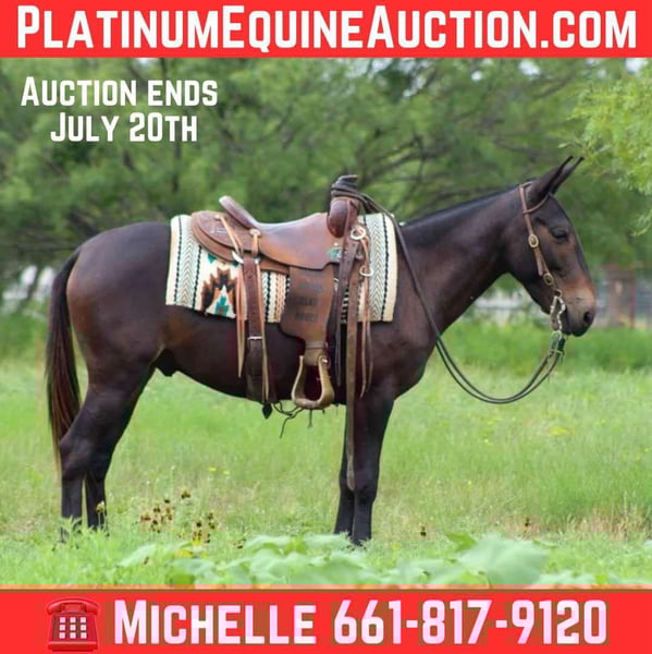ONLINE AUCTION Place your bids at www.PlatinumEquineAuction.com Starting Bid $3500 Auction ends July 20th 2025 Need a new saddle? Check out White Rock Saddles on our website or Facebook Meet 7UP, the coolest little dude on the block! At just 8 years old and standing 13.2 hands, he’s not only a dream to ride but also a fantastic driving partner. Whether you need him to pull a wagon single or double, 7UP is always up for the challenge! This fun-loving mule absolutely adores hitting the trails and is a natural in the water. He’ll confidently splash through everything from tiny creeks to big, inviting ponds—no hesitation at all! With his sure-footedness, he navigates everything from gentle hills to steep mountain trails with ease. Bridges, logs, tarps? No problem! 7UP is incredibly versatile and has experienced it all. He’s been part of many parades and rodeo grand entries, proudly carrying flags along the way. On the ranch, he excels at riding fence lines and moving cattle, and he’s been a reliable helper at the sale barn, penning cattle and loading trucks weekly. He’s a point-and-go type of mule, making him super easy to handle. Plus, he’s great with the farrier, stands tied patiently, and loads and unloads from the trailer like a champ. Best of all, 7UP gets along with everyone he meets! If you’re looking for an all-around fantastic partner that’s ready for any adventure, 7UP is your guy! Watch his video and see just how cool he is! We are open to anyone interested in him to schedule a time to come see him or if you can’t make it schedule a FaceTime showing to see him. If you need help with transport don’t hesitate to ask we have a list of reputable haulers that can get him safely to your doorstep WORLD WIDE including, Alaska , Mexico, Hawaii, Canada and anywhere in between from Stephenville, TX. Contact M$ Performance Horses Michelle 661-817-9120. ONLINE AUCTION Place your bids at www.PlatinumEquineAuction.com Starting Bid $3500 Auction ends July 20th 2025 Need a new saddle? Check out White Rock Saddles on our website or Facebook