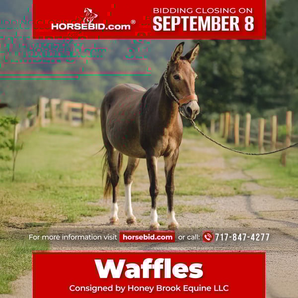 ♦️ 𝐭𝐡𝐞 𝐒𝐞𝐩𝐭𝐞𝐦𝐛𝐞𝐫 𝑺𝒆𝒍𝒆𝒄𝒕 ♦️ Happening now thru MONDAY | SEPTEMBER 8th - Available EXCLUSIVELY on HorseBid's website! For more details and to register visit: www.Horsebid.com CONSIGNOR CONTACT: Honey Brook Equine LLC 717-847-4277 LOCATION: Honey Brook, PA BREED: Mule REGISTERED: No COLOR: Bay HEIGHT: 13.1 AGE: 10 GENDER: Molly Mule Meet Waffles a cute, good lookin 10yr old Molly mule that could be your next trail partner,if you're into trail riding, waffles is to and you could do great together,she is the kind of mule that if you point her somewhere she'll go there whether it's a bridge,creek log,or whatever else you find on the trail,,if you're riding with a group she's the first one to cross a scary bridge or something the others don't wanna cross, waffles is also safe around traffic, she's just a solid,sure footed good lookin mule, or if you need a pack mule, she's proven she can do that as well.. If you like doing arena work and obstacles,she won't disappoint you there either,she is a sensitive mule and learns quickly, she's been introduced to some scary obstacles and takes it all in stride without a problem, she'll even wear a tarp or carry a flag or stand there while you practice your roping, and if you can catch with your rope she'll drag it for you as well,,be sure to watch the video,oh and she can also sidepass and open a gate for you,she sells 100 percent sound, contact us for more information