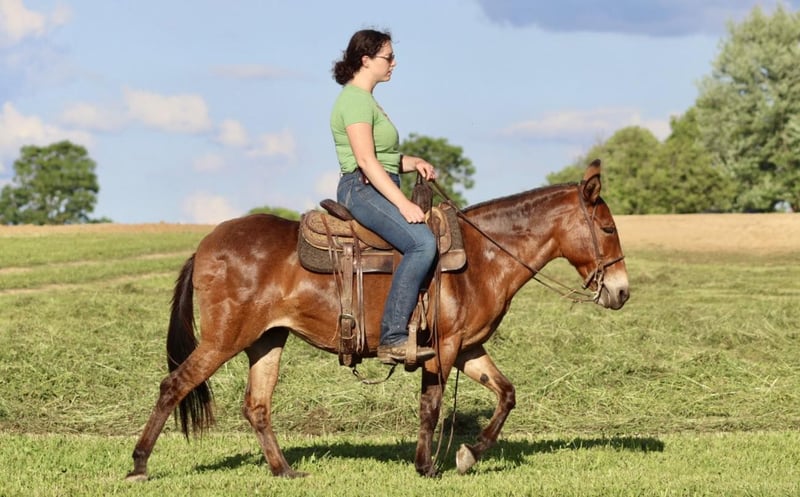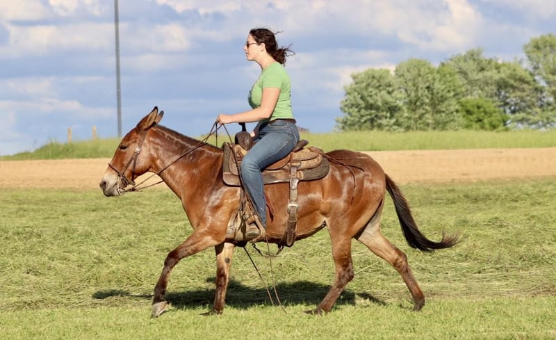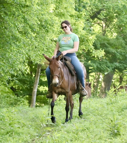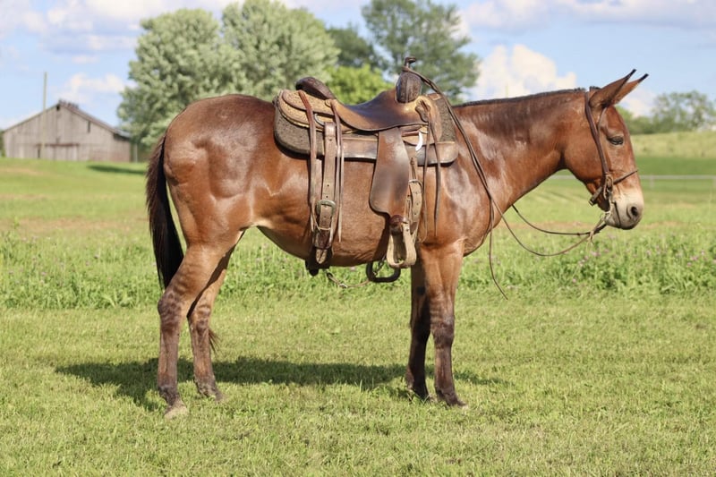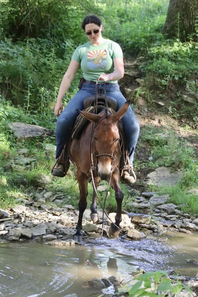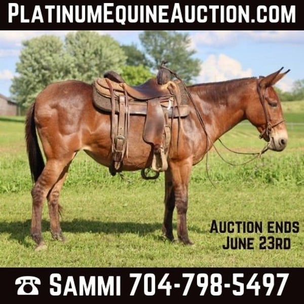 ONLINE AUCTION Place your bids at www.PlatinumEquineAuction.com Starting Bid $3500 Auction ends June 23rd, 2024 Need a new saddle? Check out White Rock Saddles on our website or Facebook! Josie is a 14.1 hand, 13 year old gaited molly mule. She is a super sweet and honest mule that the whole family loves! Don’t let her height fool you, she is stocky made and carries her rider well. She is very solid on the trails. She is careful and sure footed. Rides confidently on various terrain and crosses natural obstacles with ease. She is a smooth ride and has the best ear flopping walk you can find! She rides with the group well. Whether it’s leading, in the middle, or behind, she is happy to ride wherever. If you want to ride out alone, she does that quietly and confidently as well. She will happily walk away from the trailer with other horses/mules left behind and not cause a fuss. Josie is quiet and gentle when kids want to mess with her. She nicely lets them lead her, ride her, and climb all over her! We have trail ridden her double with our toddlers riding with us. She is traffic safe, and we have ridden her around farm equipment working with no issues. She picks up her feet nicely. Stands for saddling and mounting. Travels well. She’s been on countless overnight camping trips. Josie is a special mule that anyone is sure to love and enjoy! For more information, call Waugh Livestock Sammi 704-798-5497 Located in Brooksville, KY. ONLINE AUCTION Place your bids at www.PlatinumEquineAuction.com Starting Bid $3500 Auction ends June 23rd, 2024 Need a new saddle? Check out White Rock Saddles on our website or Facebook!