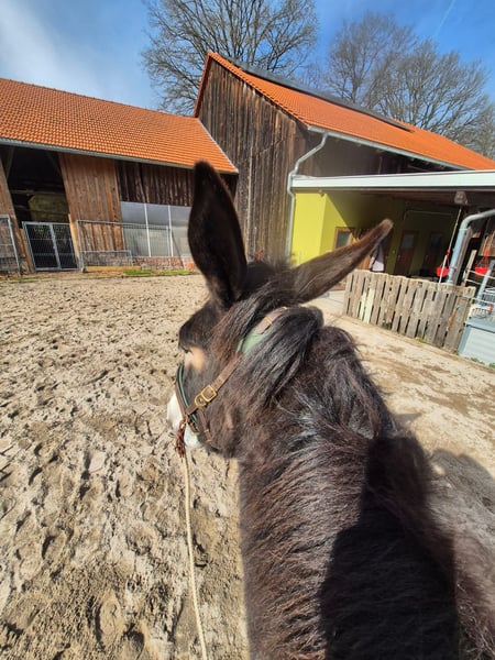 Junge Muli Stute, angeritten. Brav beim aufsteigen und auf dem Platz. Diese Stute ist nur für Mulikenner. Super intelligent und motiviert, wenn man den richtigen Zugang zu ihr hat. Vorsichtig angeritten, macht sie in jeder Trainingseinheit Fortschritte. Verladen und Transport kein Problem. Sie braucht einen sicheren und vor allem fairen Umgang. Dann wird sie ein super zuverlässiges Muli werden mit dem man viel Spaß haben wird. Leider etwas Heustaubempfindlich, bei uns aber gut zu händeln, da ich einige empfindliche Pferde habe.