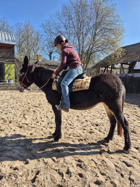 Young mule mare, ridden. Well-behaved when mounting and in the arena. This mare is only suitable for experienced mule handlers. Incredibly intelligent and motivated when approached correctly. Cautiously started under saddle, making progress with every training session. Loading and transportation are no issue. She requires a confident and, above all, fair handler. With proper handling, she will become a very reliable mule that provides lots of fun. Unfortunately, she is somewhat sensitive to hay dust, but we manage it well since I have several sensitive horses.