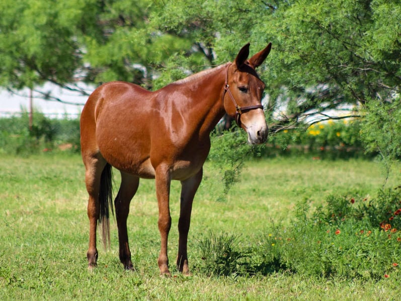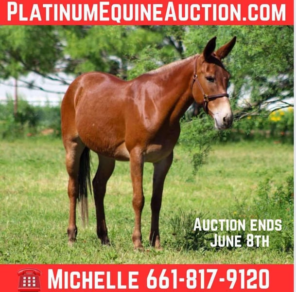 ONLINE AUCTION Place your bids at www.PlatinumEquineAuction.com Starting Bid $3500 Auction ends June 8th, 2025 Need a new saddle? Check out White Rock Saddles on our website or Facebook! Meet Cherry Bomb, the ultimate 8-year-old molly mule who’s as sweet as she sounds! Standing at a perfect 15 hands tall, this little lady is a true gem. With her vibrant red coat, she’s definitely the bomb.com! Cherry Bomb has dabbled in just about everything you can think of and has been exposed to all sorts of adventures. She’s spent countless hours working on the ranch, tackling all the chores with ease. Always low-headed and relaxed, she travels on a loose rein, making her a “point and go” kind of mule. Whether it’s a week-long camping trip or a hunting excursion, Cherry Bomb has proven herself time and again—she’s even helped pack deer out of the backcountry! With many miles of trails under her hooves, Cherry Bomb is as sure-footed as they come. She confidently navigates steep rocky paths, crosses logs and bridges, and doesn’t hesitate to splash through creeks and rivers of all sizes. Plus, she’s great at ponying horses and colts, whether it’s out on the trail, in the pasture, or just a quick exercise session in the arena. Cherry Bomb has been desensitized to a variety of sights and sounds—she’s had guns shot off around her, carries flags, and even packs tarps without breaking a sweat. In the arena, she shines with a smooth jog and lope, and she’s responsive to leg cues and neck reining. While she’s not a speed demon, her laid-back attitude makes her a joy to ride. This girl has even tackled traffic on the highway and handled her first visit to the famous Fort Worth Stockyards like a pro! She walked confidently down the bustling Exchange Avenue, unfazed by the crowds, loud music, horse-drawn carriages, and even the iconic longhorn cattle drive. Cherry Bomb has also shown off her skills on trail courses, maneuvering over tires, logs, bridges, and various obstacles with grace. Always eager to please, Cherry Bomb meets you at the gate with a friendly attitude, ready to work. She’s great with her ears, easy to tack up and bridle, loads and unloads from the trailer like a champ, stands patiently for the farrier, and enjoys bath time. She ties well and is just an all-around wonderful mule! We absolutely adore Cherry Bomb and know her new owners will love her just as much as we do. Check out her video to see all the amazing things she can do—she’s truly one of a kind! We are open to anyone interested in her to schedule a time to come see her or if you can’t make it schedule a FaceTime showing to see her. If you need help with transport don’t hesitate to ask we have a list of reputable haulers that can get her safely to your doorstep WORLD WIDE including, Alaska , Mexico, Hawaii, Canada and anywhere in between. For more info contact M $ Performance Horses Michelle 661-817-9120. ONLINE AUCTION Place your bids at www.PlatinumEquineAuction.com Starting Bid $3500 Auction ends June 8th, 2025 Need a new saddle? Check out White Rock Saddles on our website or Facebook!