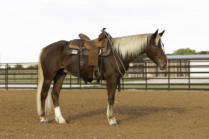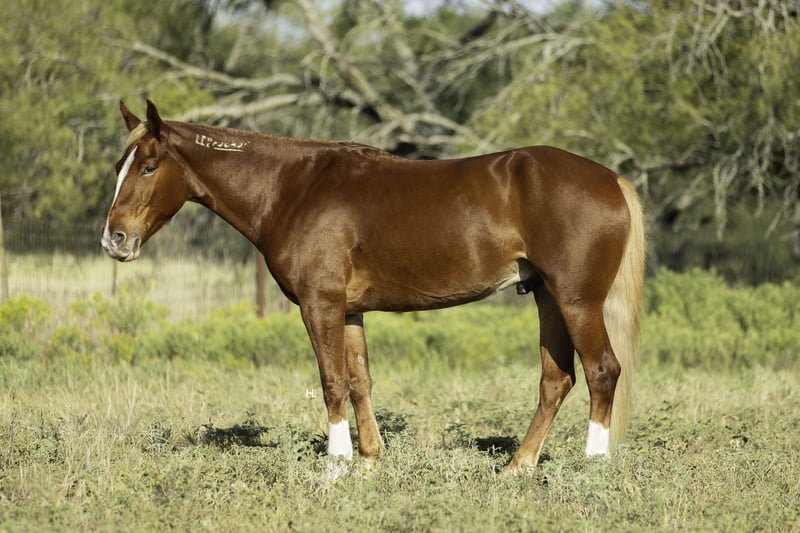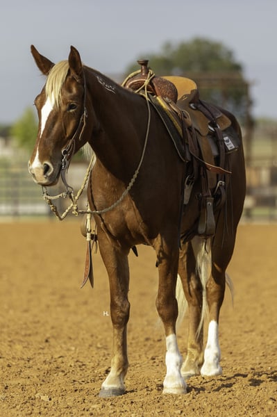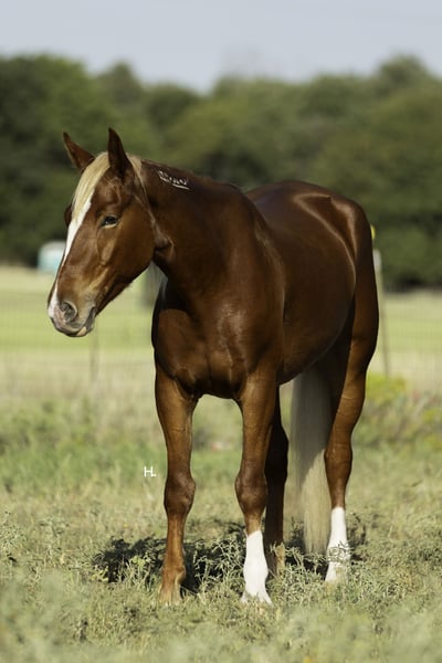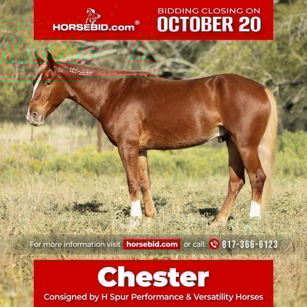 ♦️ 𝐭𝐡𝐞 𝐀𝐌𝐄𝐑𝐈𝐂𝐀𝐍 𝓕𝓪𝓵𝓵 𝓒𝓵𝓪𝓼𝓼𝓲𝓬 ♦️ Happening now thru MONDAY | OCTOBER 20th - Available EXCLUSIVELY on HorseBid's website! For more details and to register visit: www.Horsebid.com CONSIGNOR CONTACT: H Spur Performance & Versatility Horses 817-366-6123 LOCATION: Weatherford, TX BREED: Mustang REGISTERED: Yes REGISTERED NAME: Chester COLOR: Chestnut HEIGHT: 14.3 AGE: 6 GENDER: Gelding We’ve heard all of the stigmas surrounding them : “They can’t be soft and responsive.” “They’re not safe around kids.” “They’ll never be as good as domestic horses.”… but Chester is here to prove you wrong, and I promise he will. Chester is a 6yr old, BLM branded mustang that was gathered from the Sand Wash Basin in Colorado in 2021. From there Chester has blossomed into not only being the kindest soul, but an absolute favorite in the saddle. From ranch rodeos to ranch versatility shows to being a whole family type of horse, he’s gone above and beyond to prove his worth in every aspect. If you’re wanting a responsive and easy ride in the arena, you’ll be pleased when you climb into the saddle that’s on Chester’s back. He’s always in tune with his rider, picking up on not only cues from your legs but your seat as well, making everything feel effortless and easy. He’ll trot and lope the prettiest circles on as much rein as you’d like to give him; never going any faster than asked. Chester side passes easily both directions, will turn on his haunches or on the forehand, can do a flying lead change both directions, and will come to an easy stop or let the dirt fly with his impressive slide. If you feel like having some fun, you can peel his bridle off with the confidence of knowing he's still listening to you every step of the way. Chester has also done a multitude of things in the arena other than just being enjoyed. From ranch rodeos to ranch versatility shows, he’s competed in both with an undeniable presence. Although he’s just started his ranch versatility show career, he’s impressed judges with his natural ability and cadence scoring +1 on several scorecards for a multitude of maneuvers in several different classes. Not only does Chester have the ability to be a show horse, he shows real promise to take his rider to the pay window in the roping pen as he’s been both headed and heeled off of too. Outside of the arena, Chester has been used extensively to gather, sort, brand, and doctor in all different types of terrains. He’s as cowy as any NCHA competitor and will never quit you; catch him in the dim morning light and put him back at dusk and he will be happy to do it all again the next day. Not only has he been used for work outside, but Chester has also been ridden outside for leisure and is happy to travel down the trail alone or in a group. He handles vehicle and pedestrian traffic with ease as well as any obstacles you may come upon like downed trees, creeks, or street crossings. He’s patient, will ground tie if you need to get off for any reason, and stands quietly for you to get on without taking a step until you’re ready. Not only is Chester an absolute pleasure in the saddle but he’s just as enjoyable, if not more, to be around on the ground. If there is one thing Chester does not lack, that’s personality. His sweet nature makes all things a breeze from saddling to grooming and he enjoys just hanging out with you like another member of the family. He loads and unloads like any gentleman should and is quiet in the trailer when hauling. We’ve also ridden Chester after he’s had time off and he has never offered to do wrong in any way. Chester has good feet, no vices, and has never required any sort of maintenance or special care. He’s been an absolute joy to have in our program, and we know he’ll be a barn favorite for you too. We invite you to come meet Chester at our home in Weatherford, TX and can help set up hauling to wherever it is you call home. PPEs welcomed as always. More pictures and videos can be found by visiting Chester’s page on our website, www.hspurhorses.com/chester. For any questions and to talk about if Chester is right for you, don’t hesitate to contact Sarah at 817-366-6123.