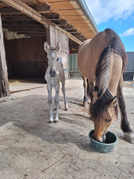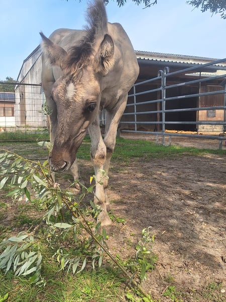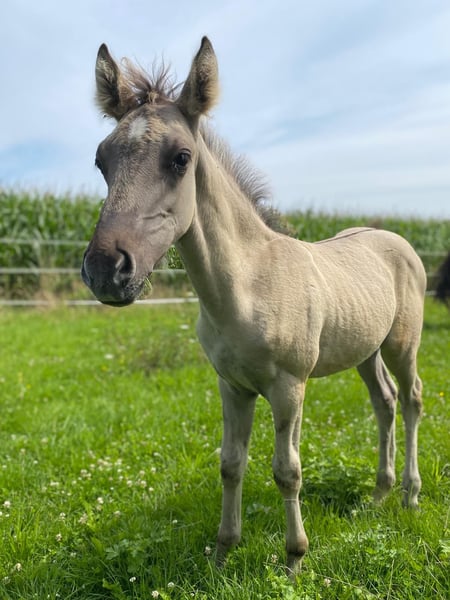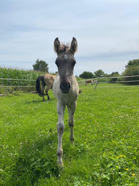 For sale is a handsome Kiger Mustang colt born on June 24, 2025, in the Grullo color with a two-tone mane. LJ-Aurelio is a little gem, friendly in handling and working appropriately for his age. He currently still lives with his mother and aunt. After weaning, he will be moved to a stallion group to learn important social skills. His expected height is approximately 15.8 hh. He can stay with us for further upbringing if desired. For more information, please contact us at 0173 9521224.