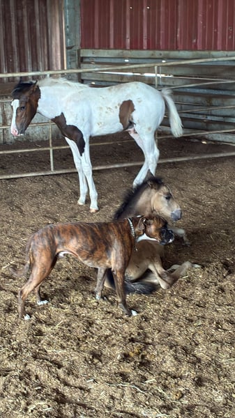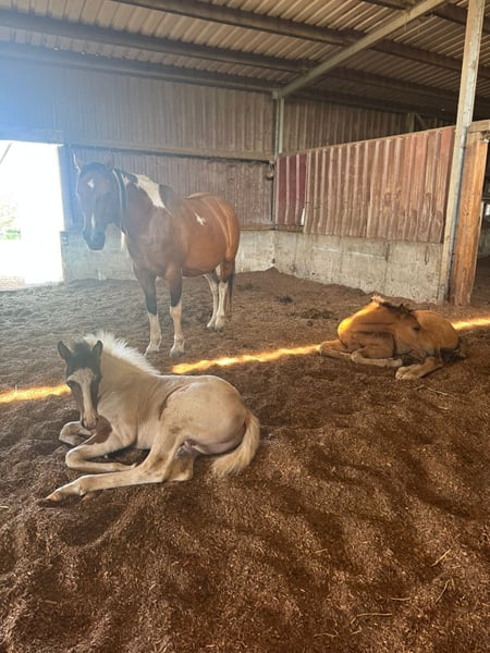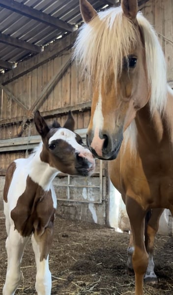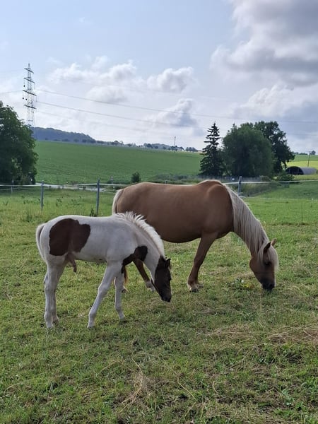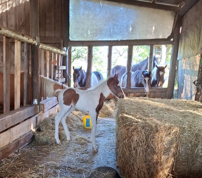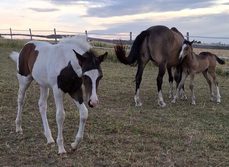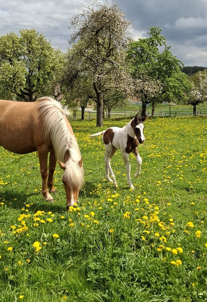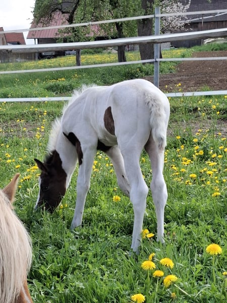 Indigo Inferno was born on April 21, 2025. His two parents are also Mustangs. His mother, Winny Whisper, is a beautiful 5-year-old Palomino mare, and his father, Inferno, is a 22-year-old dark bay Tobiano, who have produced this fantastic dream Mustang. The little one is well-muscled and has great basic gaits. He will be versatile in his future use. He is correctly built and will be a strong and stable Mustang with a short back and a good height, which will be at least 152-155 cm. He is a very nice and people-oriented handsome boy. By the time he is weaned, he will have mastered at least the basics of foal training. He can be brought to his new home or can stay with us for a while longer. Anyone interested in this special young man is welcome to contact us for further questions regarding papers and other details. We only place our horses in good and species-appropriate homes.