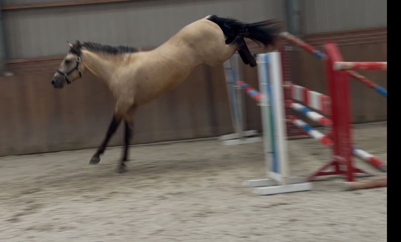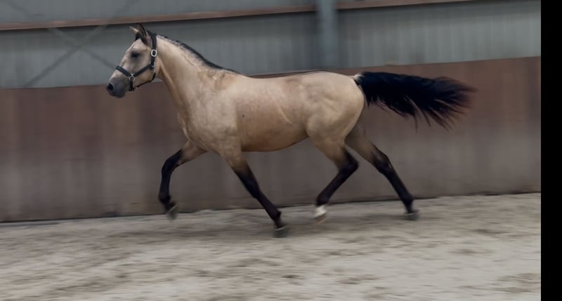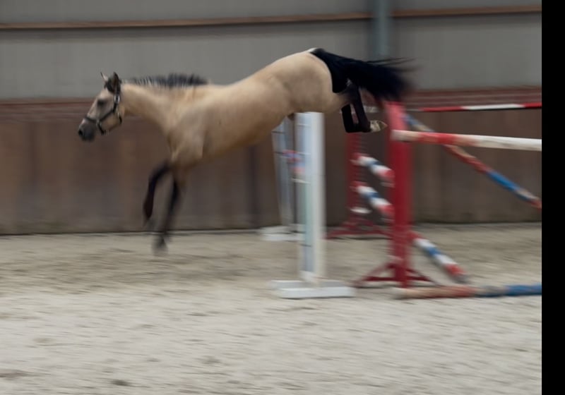Tribunolas is a very beautiful specimen. Not only because of his lovely color, but also due to his appealing type and appearance. He currently stands at a height of 1.53m. He possesses three good basic gaits. He moves with great suppleness and good leg technique. He can also naturally change leads easily. His first free jumps are promising. He shows a lot of athletic ability. He jumps with quick reflexes and good technique, consistently finishing well behind the jump. He was castrated about 6 weeks ago. Tribunolas has not yet been backed. However, he is honest in handling and has a curious and level-headed character. Please call or message if interested. A video is available. Phone: +31(0)643197337